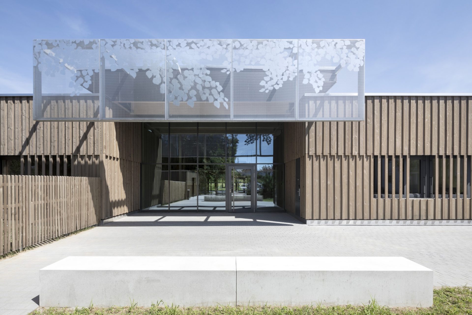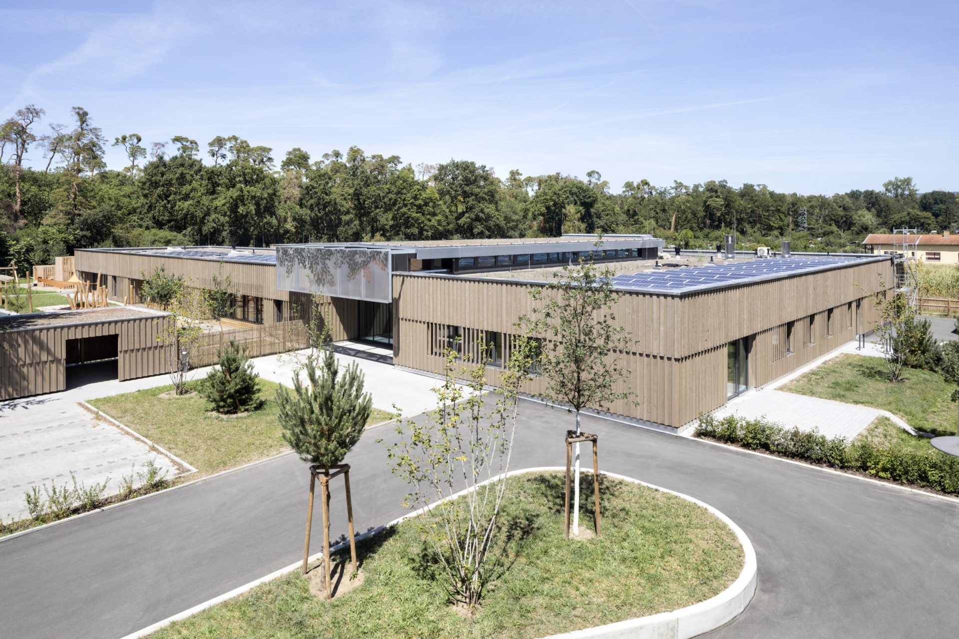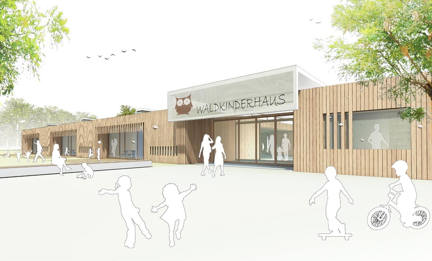 Das Kinderhaus öffnet sich mit einladender Geste zum gepflasterten Vorplatz, ein überhöhtes Vordach verbindet den Eingang mit dem Foyer und dient der Adressbildung. Vom Foyer aus öffnet sich das Haus aber auch über einen Hofeinschnitt zum Garten und zum Wald. Natur und Gebäude verschmelzen miteinander, das Kinderhaus wird zum “Waldkinderhaus”.