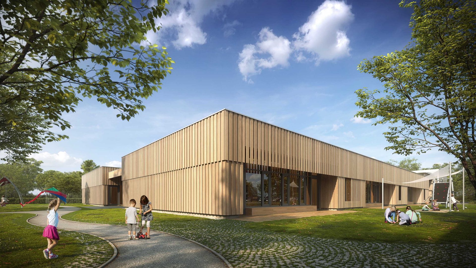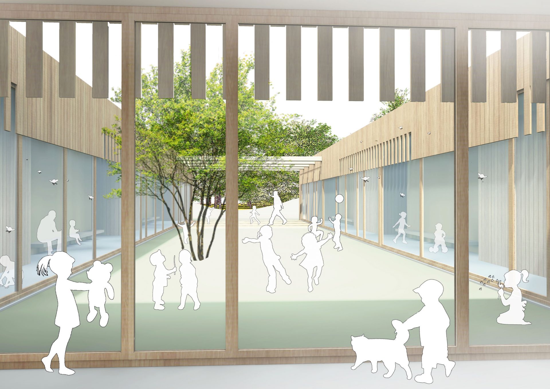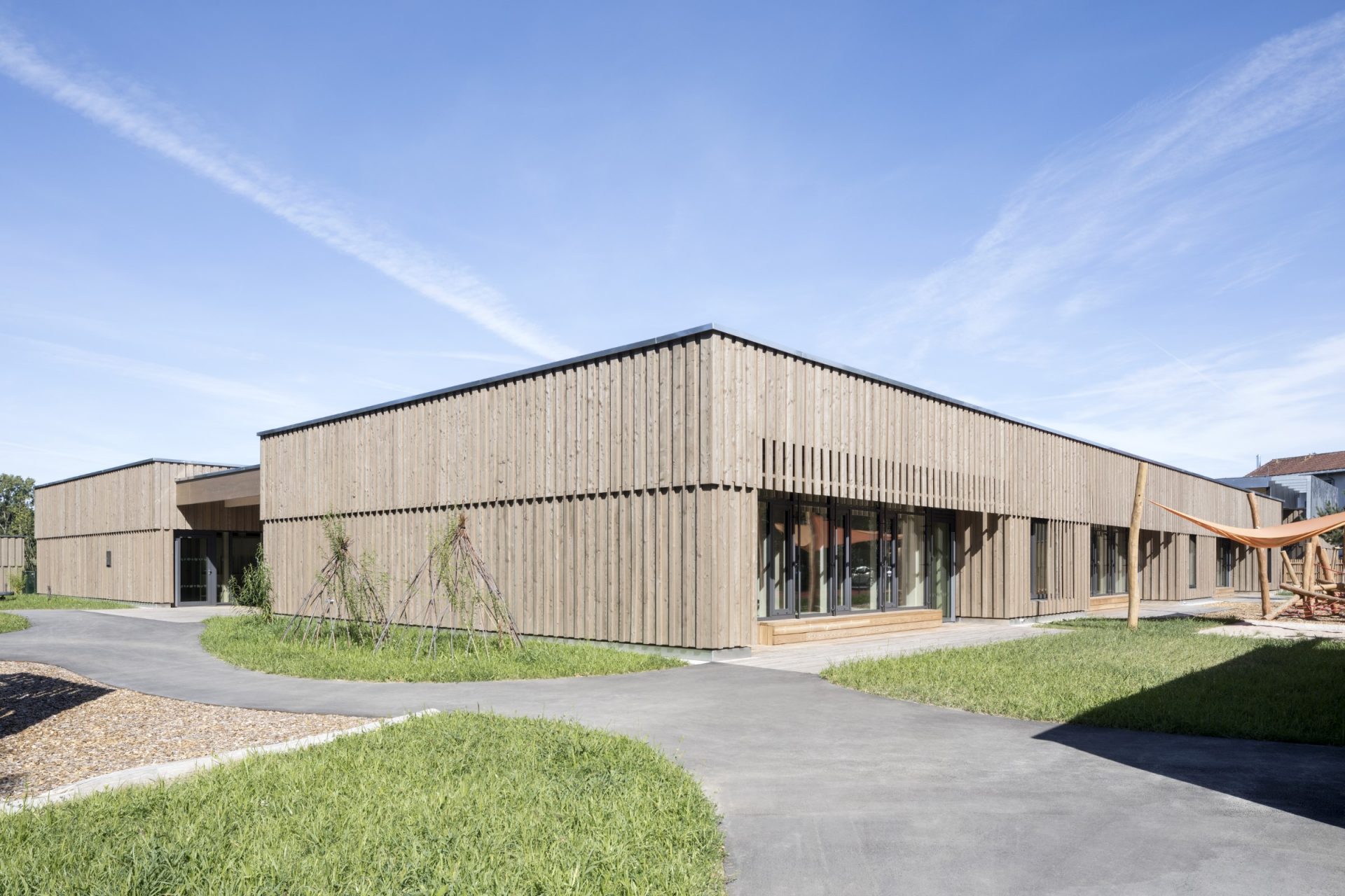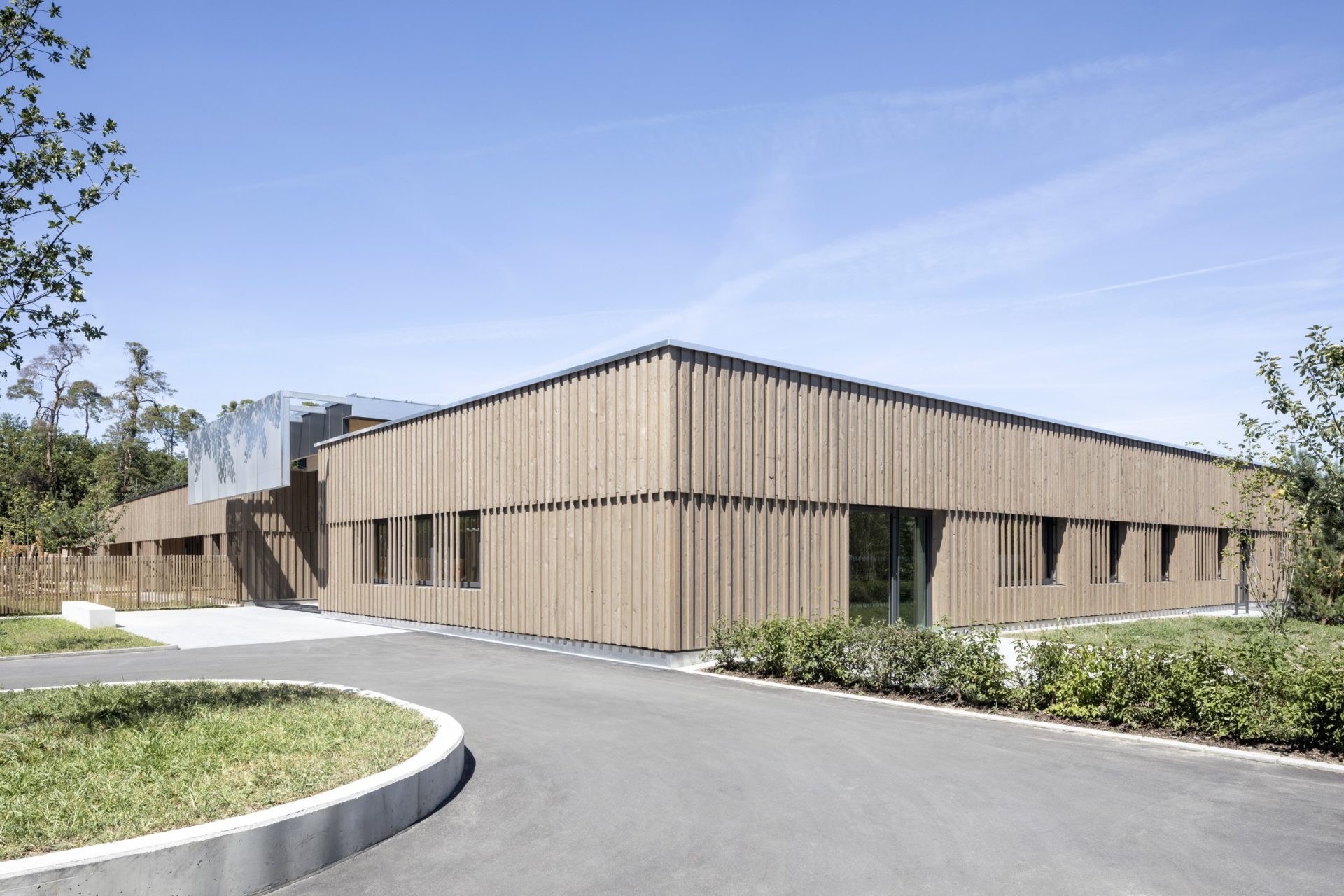 Der Grundkörper des neuen Kinderhauses besteht aus einem ruhigen eingeschossigen Baukörper. Durch seine Platzierung auf dem Grundstück und zwei tiefen Einschnitten nimmt das Gebäude sowohl die Achse zum Vorplatz als auch zum Garten/Landschaftsraum auf und verbindet beide Bereiche im Inneren miteinander.