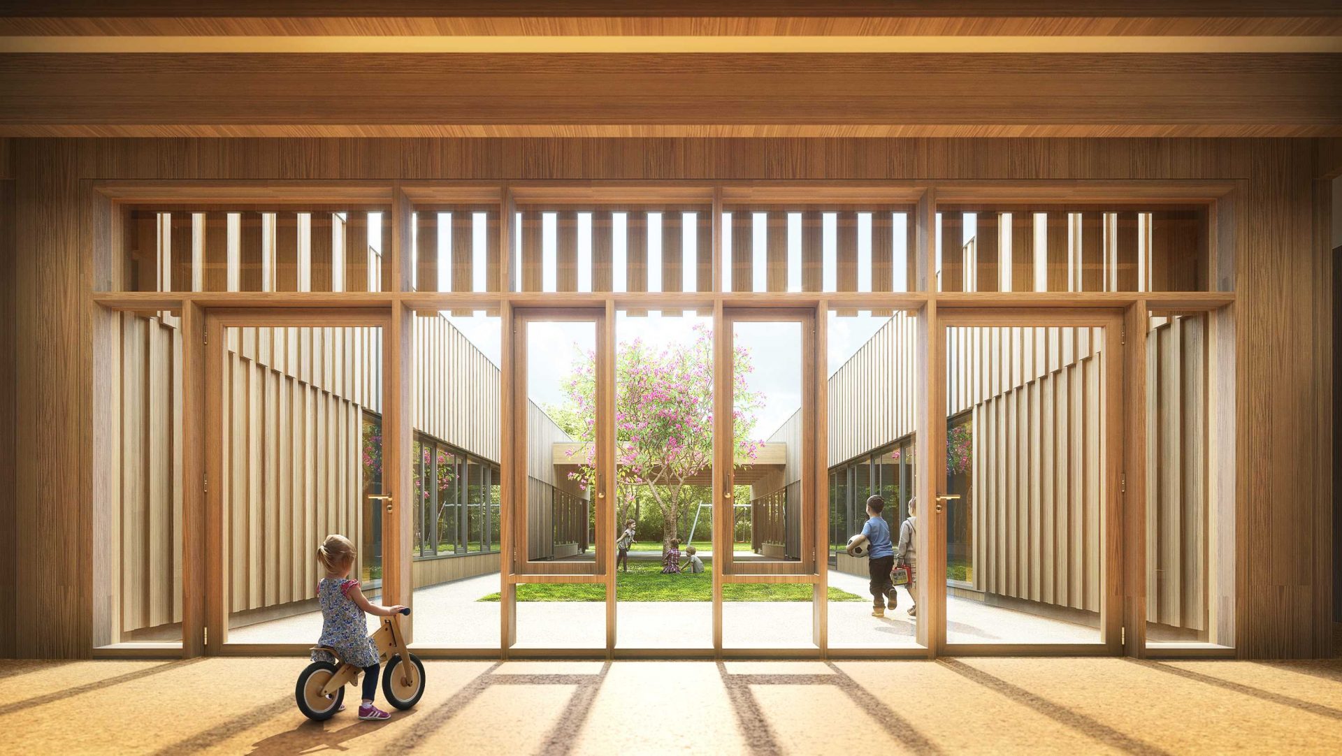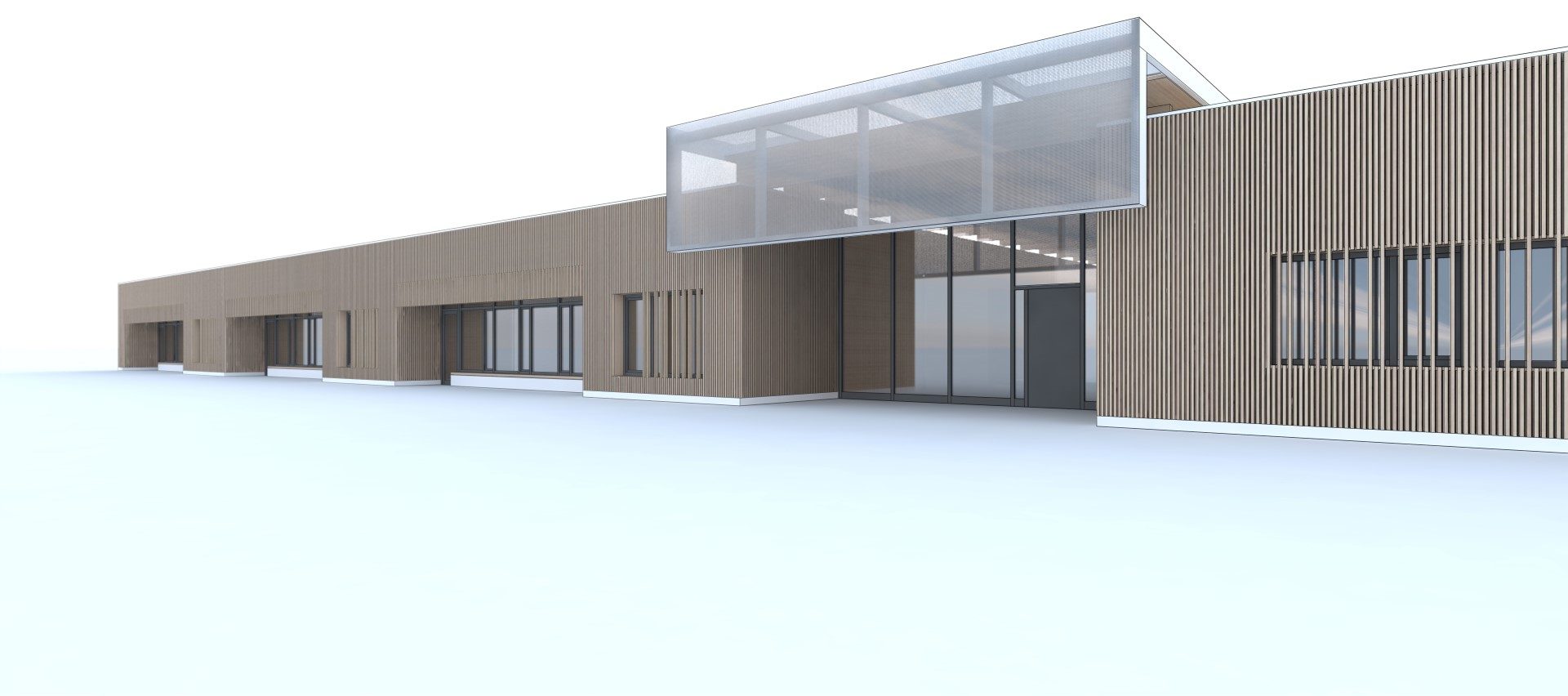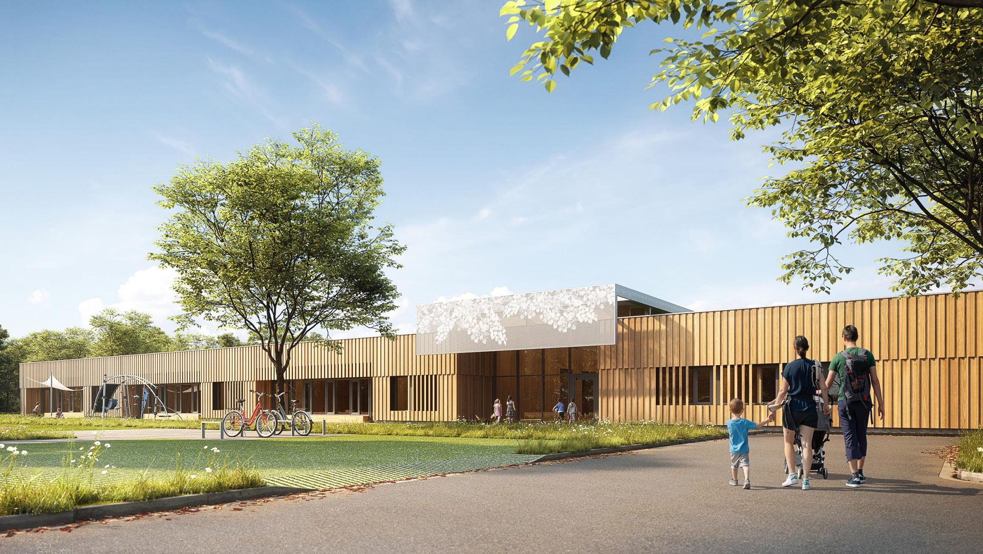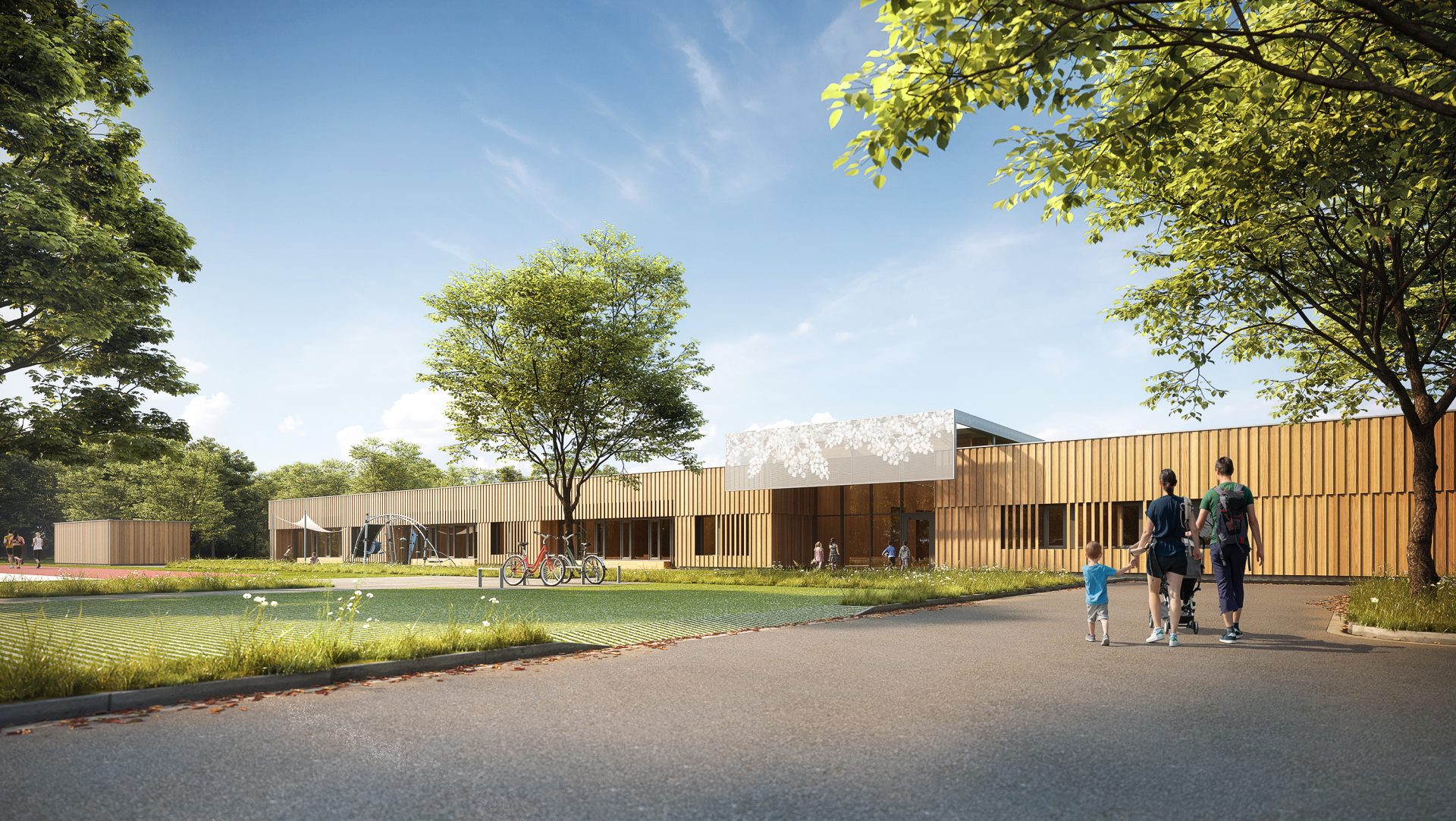 Der Grundkörper des neuen Kinderhauses besteht aus einem ruhigen eingeschossigen Baukörper. Durch seine Platzierung auf dem Grundstück und zwei tiefen Einschnitten nimmt das Gebäude sowohl die Achse zum Vorplatz als auch zum Garten/Landschaftsraum auf und verbindet beide Bereiche im Inneren miteinander.