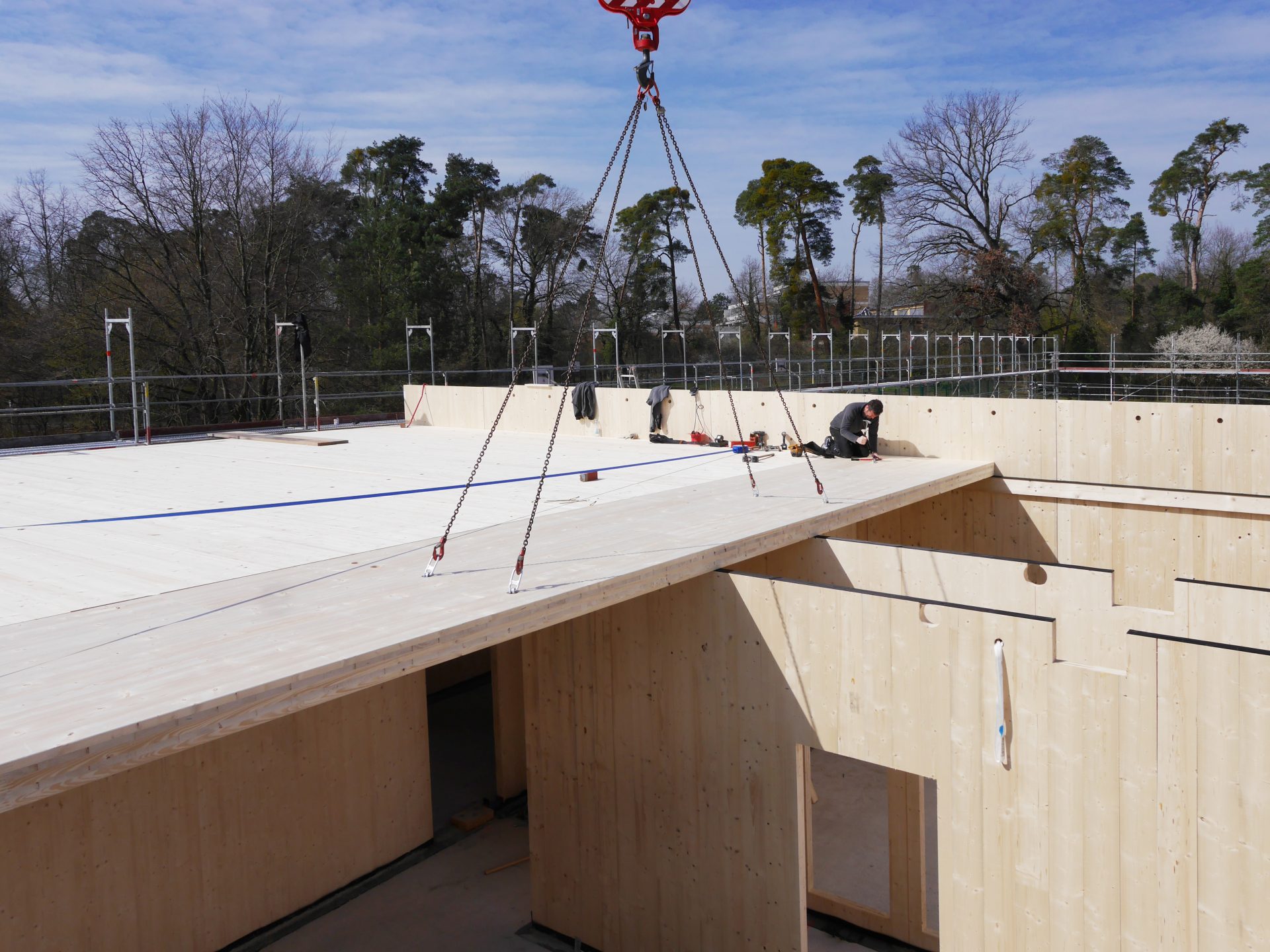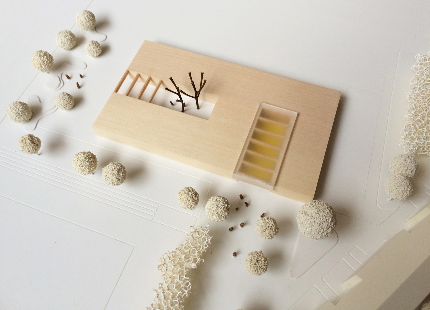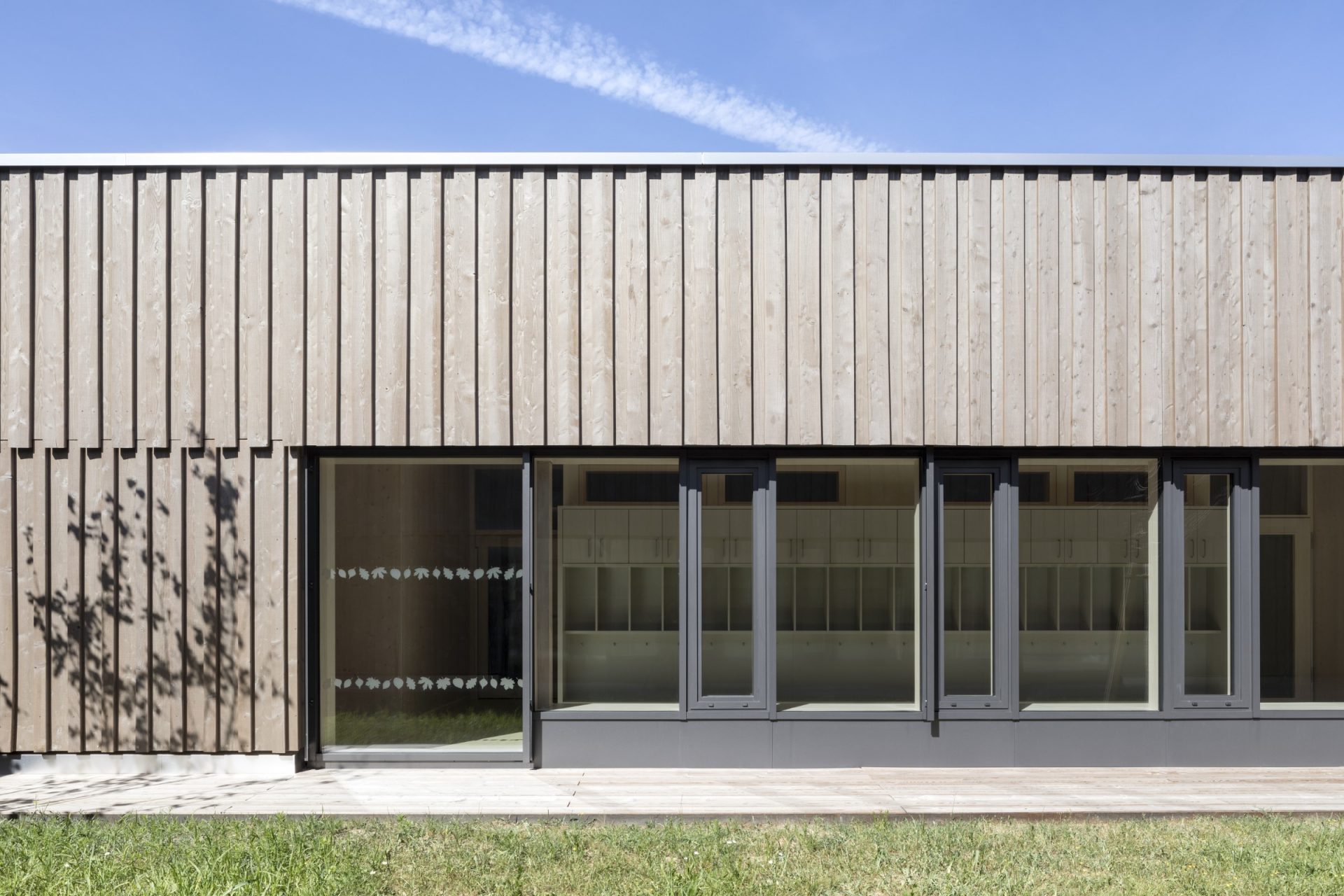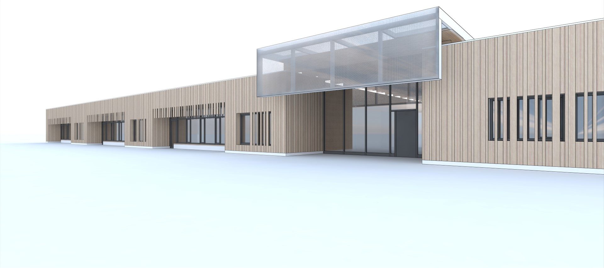 Der Grundkörper des neuen Kinderhauses besteht aus einem ruhigen eingeschossigen Baukörper. Durch seine Platzierung auf dem Grundstück und zwei tiefen Einschnitten nimmt das Gebäude sowohl die Achse zum Vorplatz als auch zum Garten/Landschaftsraum auf und verbindet beide Bereiche im Inneren miteinander.