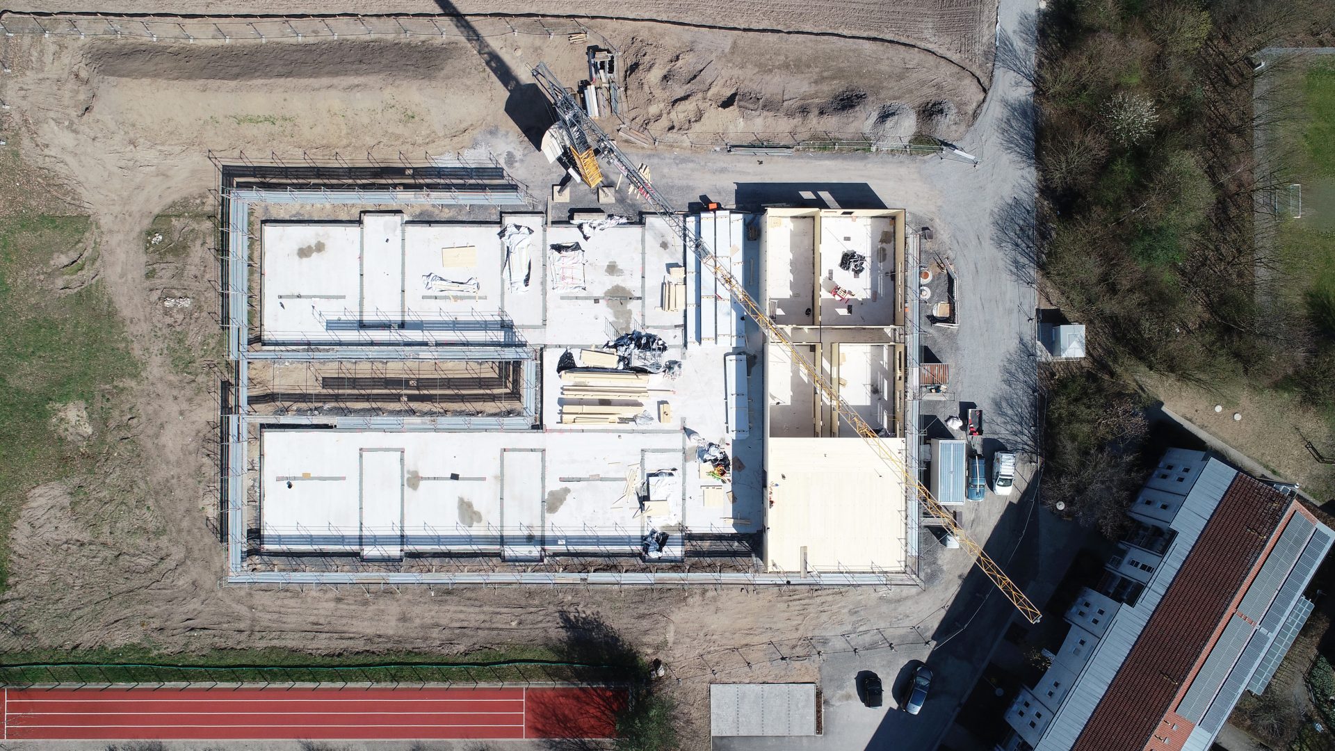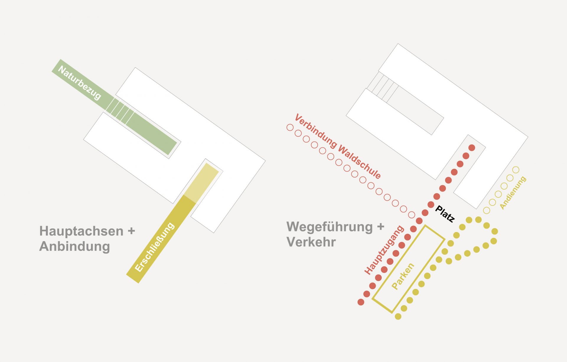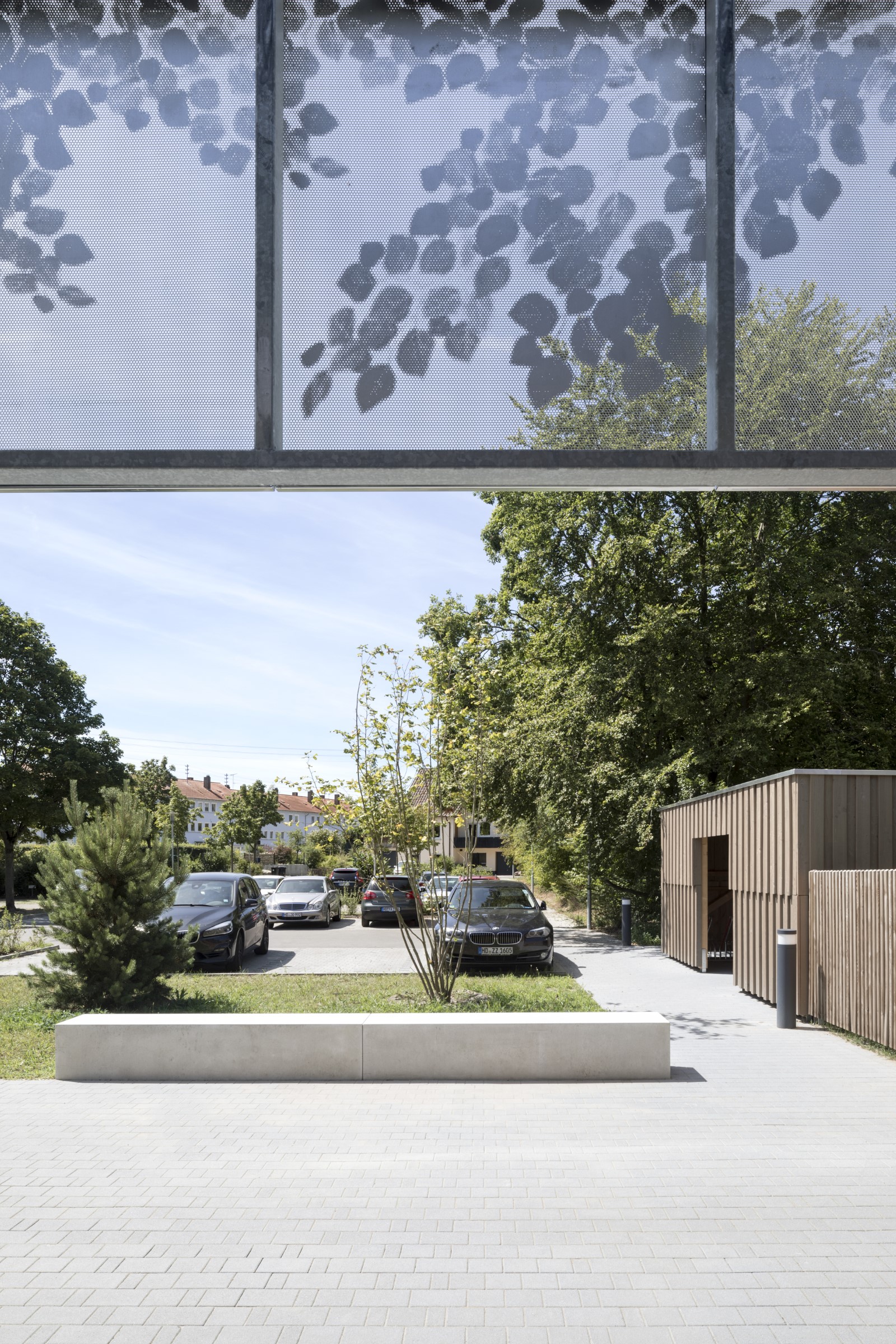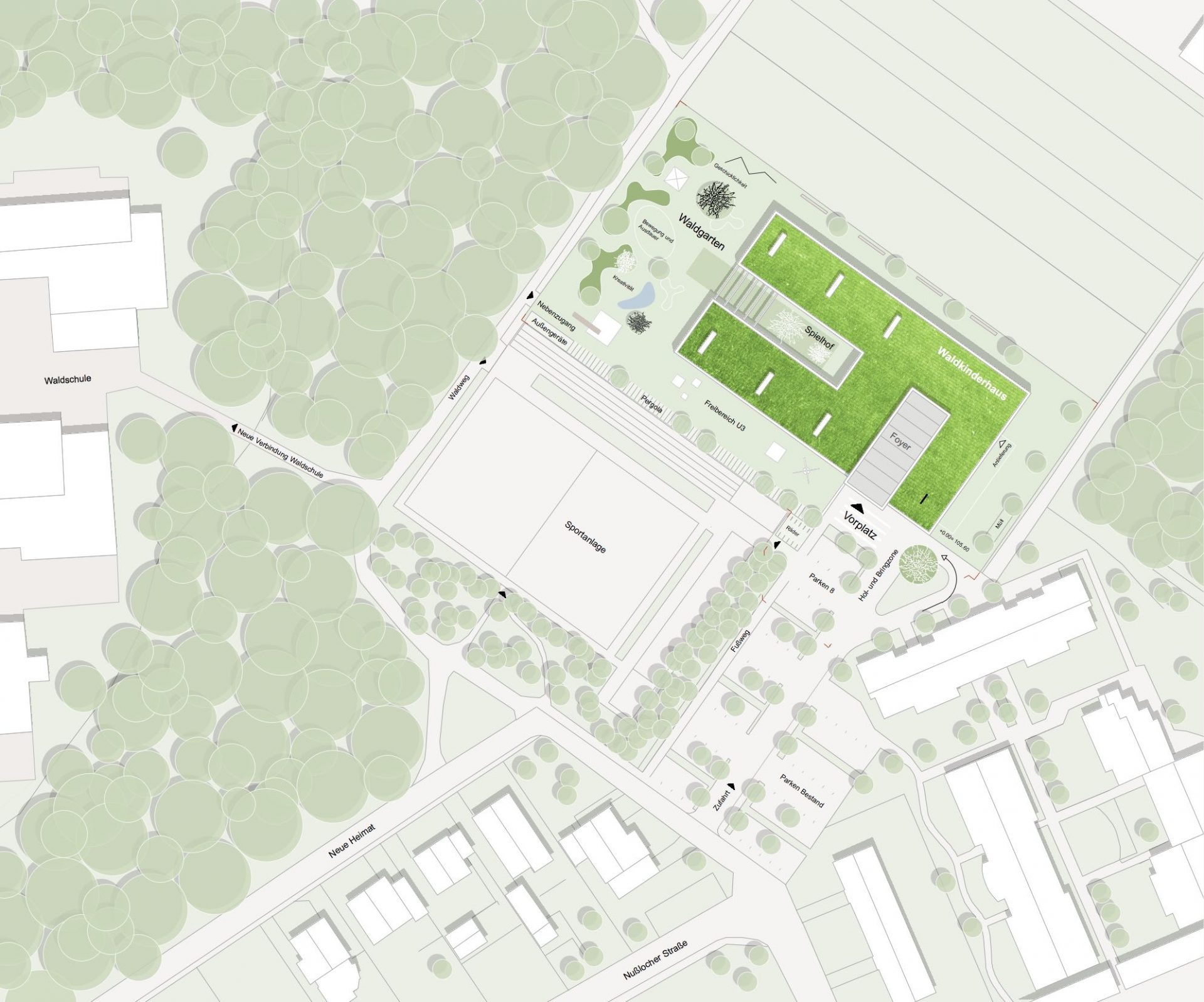 Das Kinderhaus wird von Südwesten über die Anliegerstraße “Neue Heimat” erschlossen. Von der Straße aus führen zwei parallele Verbindungen zum Gebäude, ein Fußweg und ein Weg für den motorisierten Verkehr. Beide sind durch einen begrünten Parkierungsstreifen voneinander getrennt, was einen sicheren Weg für Groß und Klein zum Kinderhaus garantiert. Über den Fahrweg erfolgt das Holen und Bringen der Kinder mit dem Auto. Aber auch die Anlieferung und Entsorgung erfolgt hier, und stört die übrigen Abläufen im Gebäude nicht.