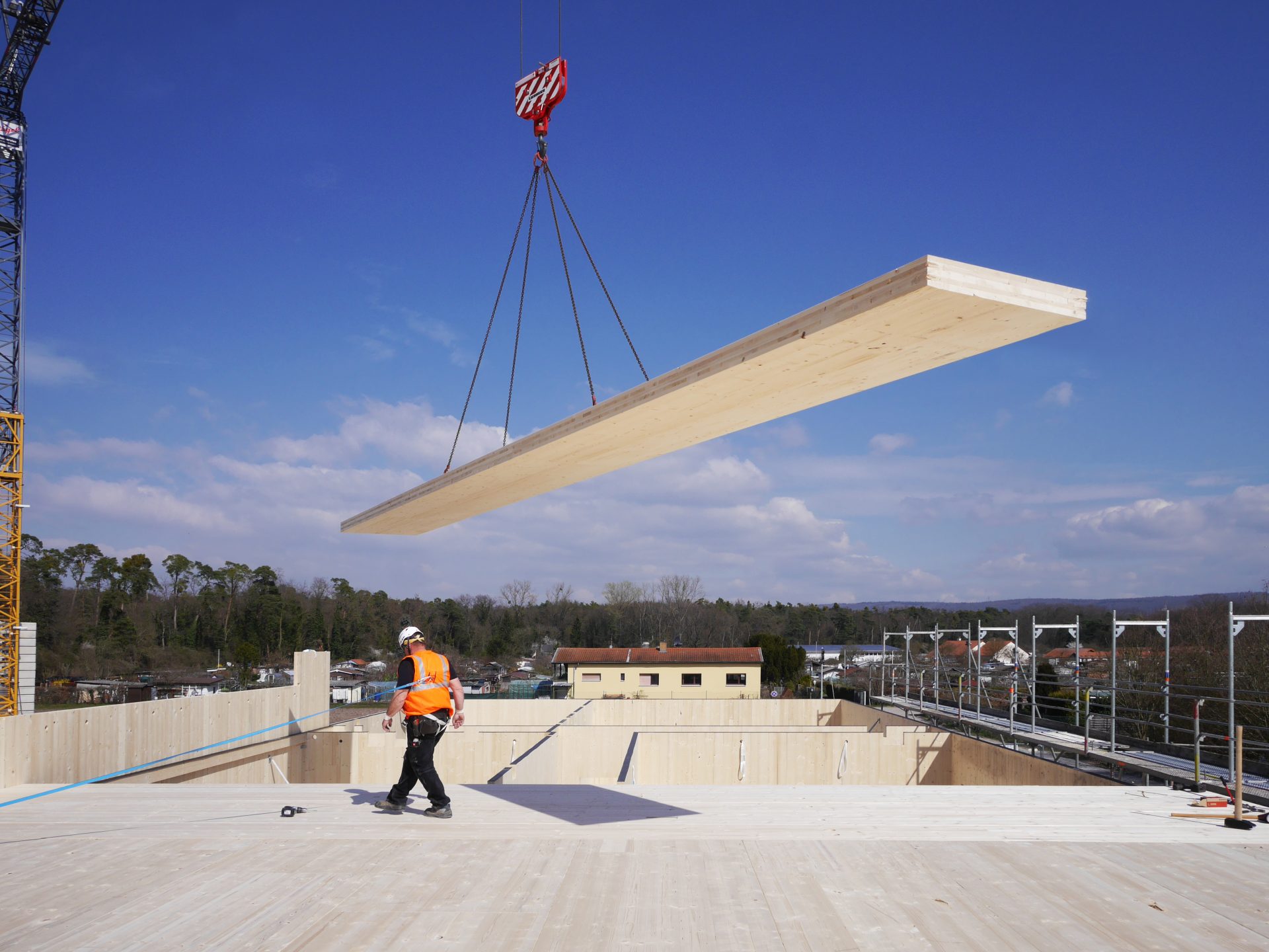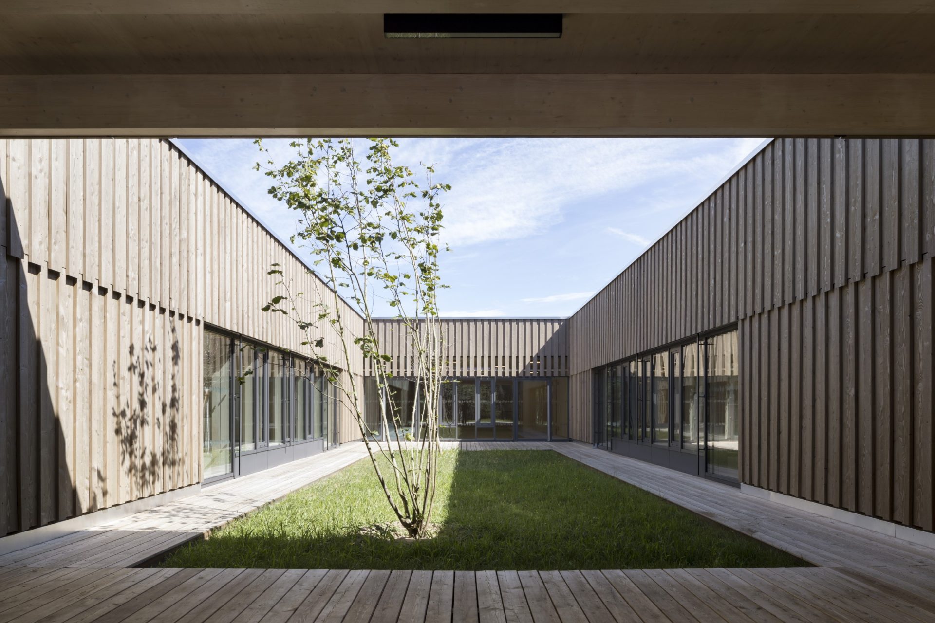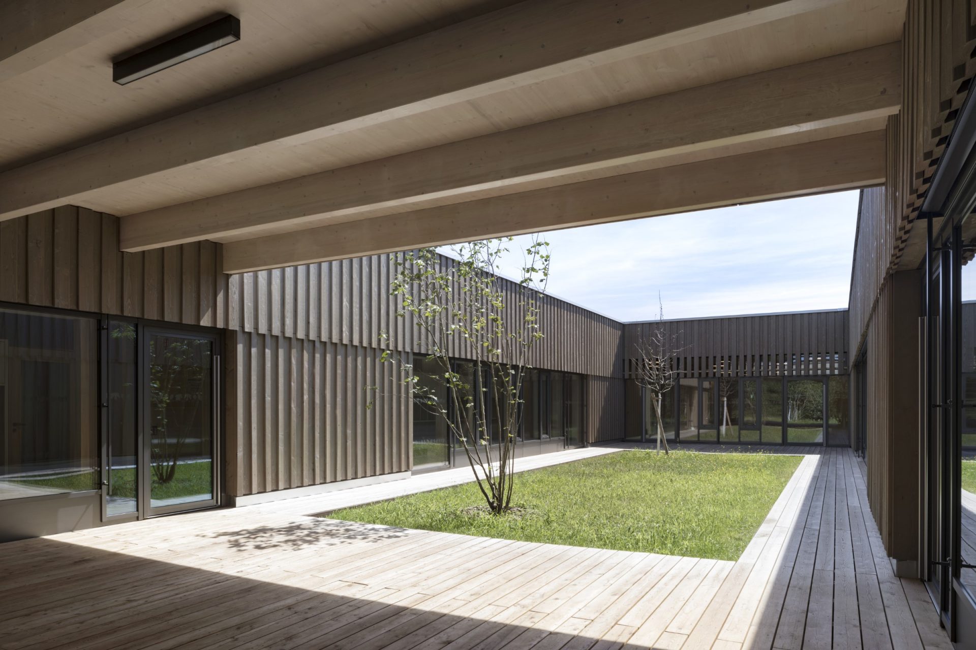 Das Tageslichtspektrum wird im gesamten Gebäude und im Gartenhof erlebbar. Vorgelagerte Terrassen orientieren sich zu allen Richtungen hinaus, ermöglichen interessante  Ausblicke zur Landschaft und zum Sportpark.