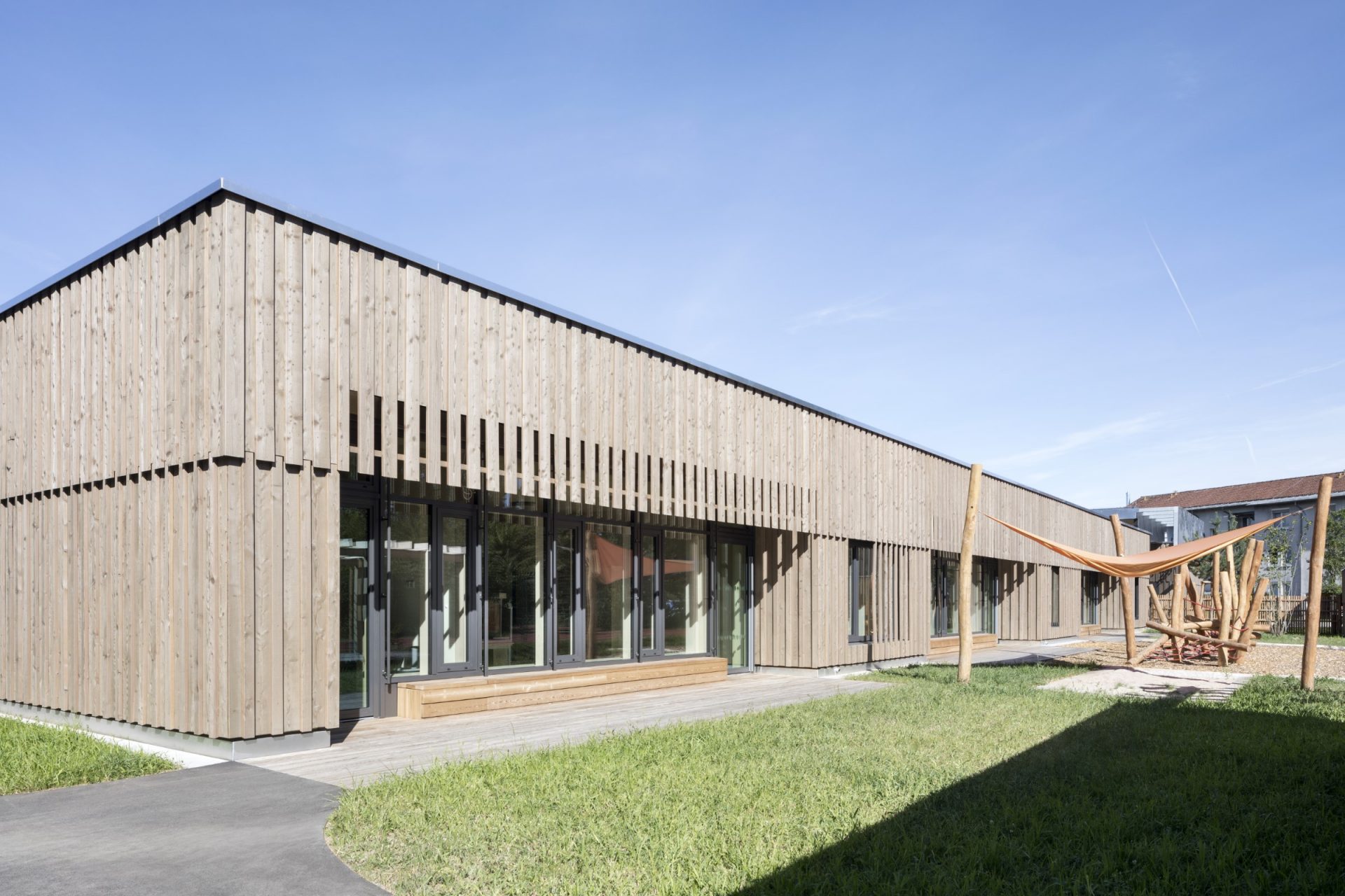 Der Baukörper ist geprägt durch sein einfaches und klares Erscheinungsbild. Die differenzierte Grundrissausbildung fördert die Begegnung, Annäherung und Kommunikation zwischen den Kindern, bietet auf der anderen Seite aber auch eine Lebenswelt mit Rückzugsmöglichkeiten und angenehm entspannter Atmosphäre. Integration, Gemeinschaft und individuelle Förderung müssen sich gegenseitig nicht ausschließen.