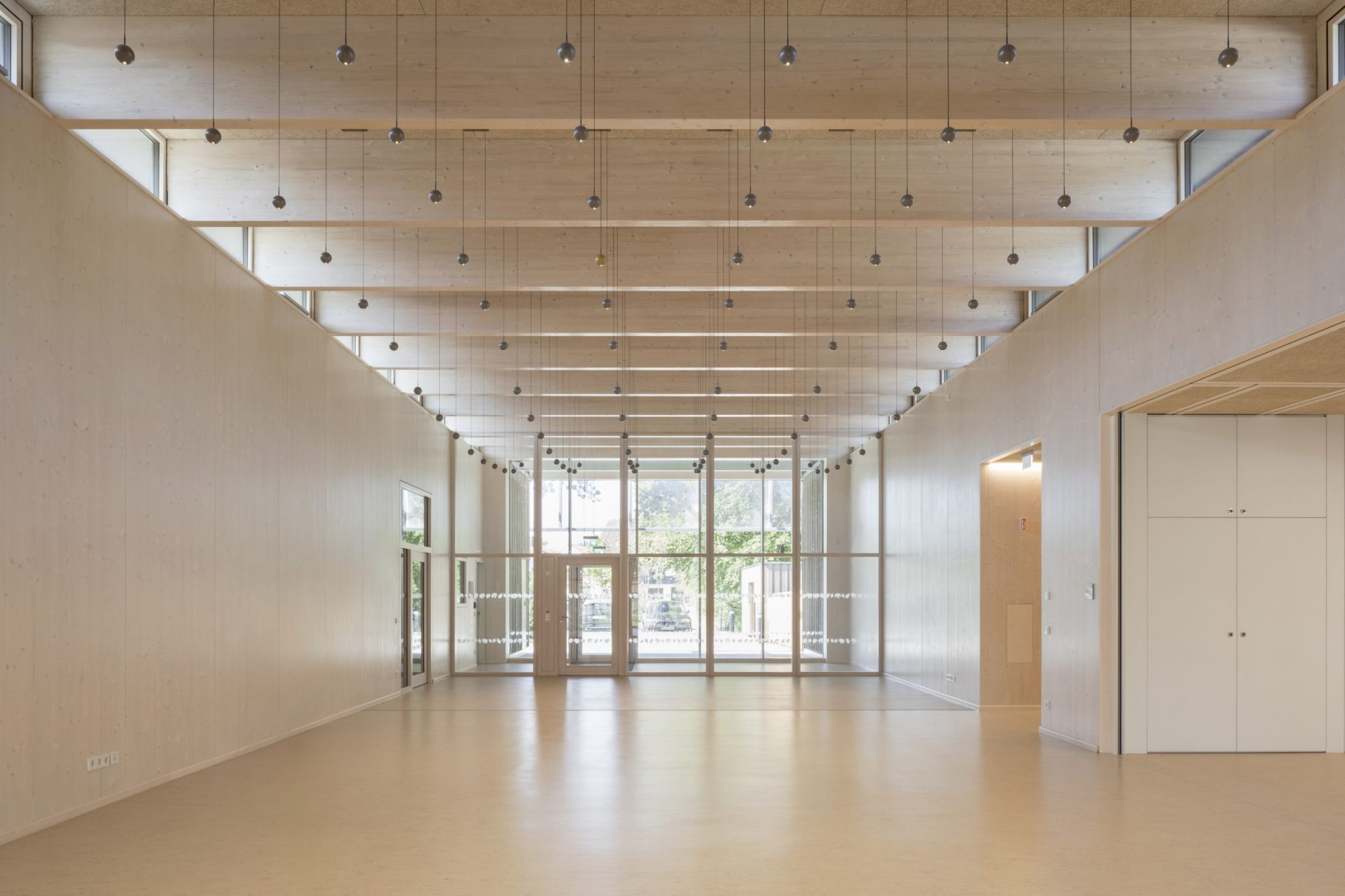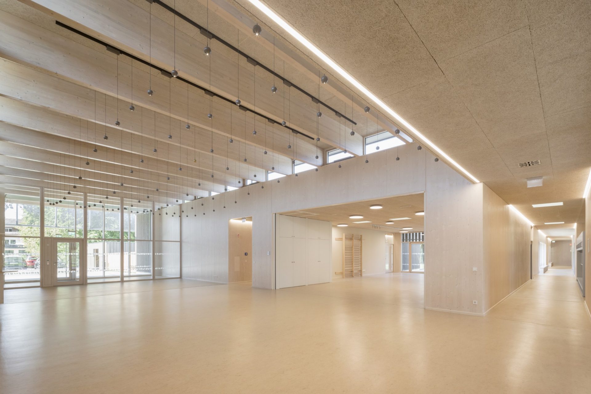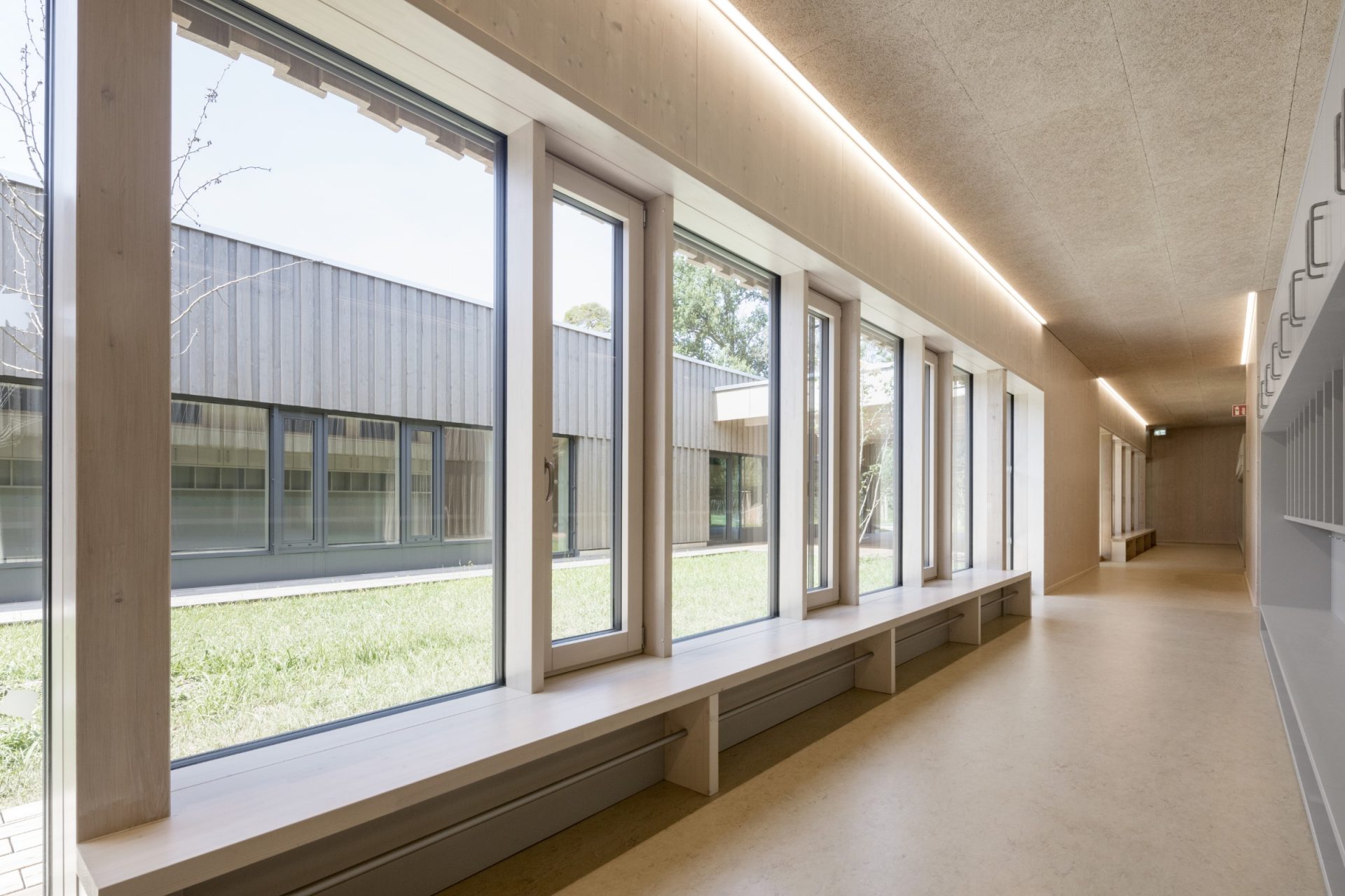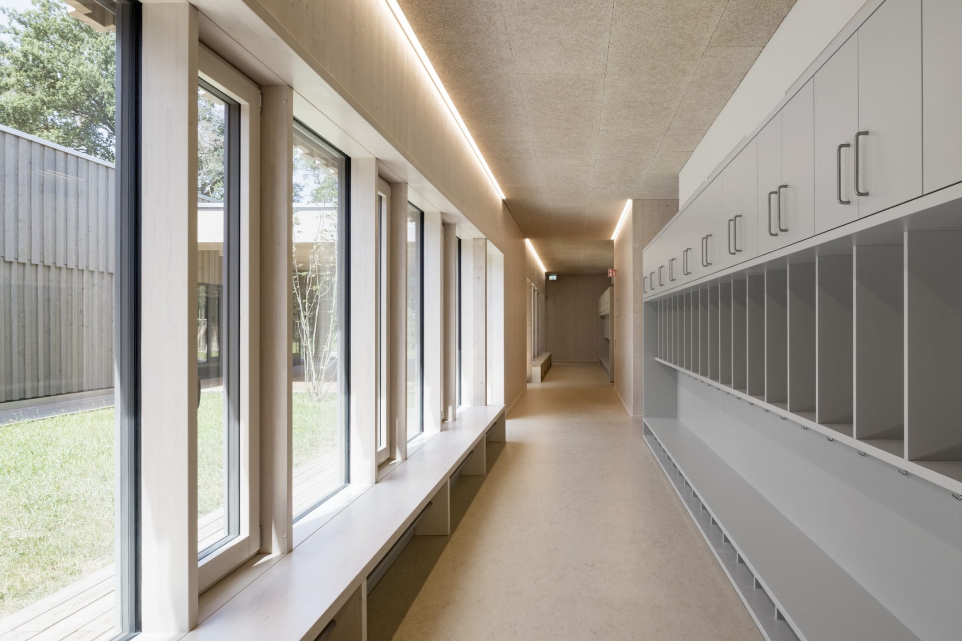Die Gänge werden durch Aufweitungen und Sitzmöglichkeiten zu gemeinschaftlichen Erlebnisräumen mit Aktivzonen und Ruhezonen. Sie sind gleichzeitig aber auch kindgerechte Orientierungsinseln und für das Personal gut einsehbare Orte mit größtmöglicher Übersicht.
