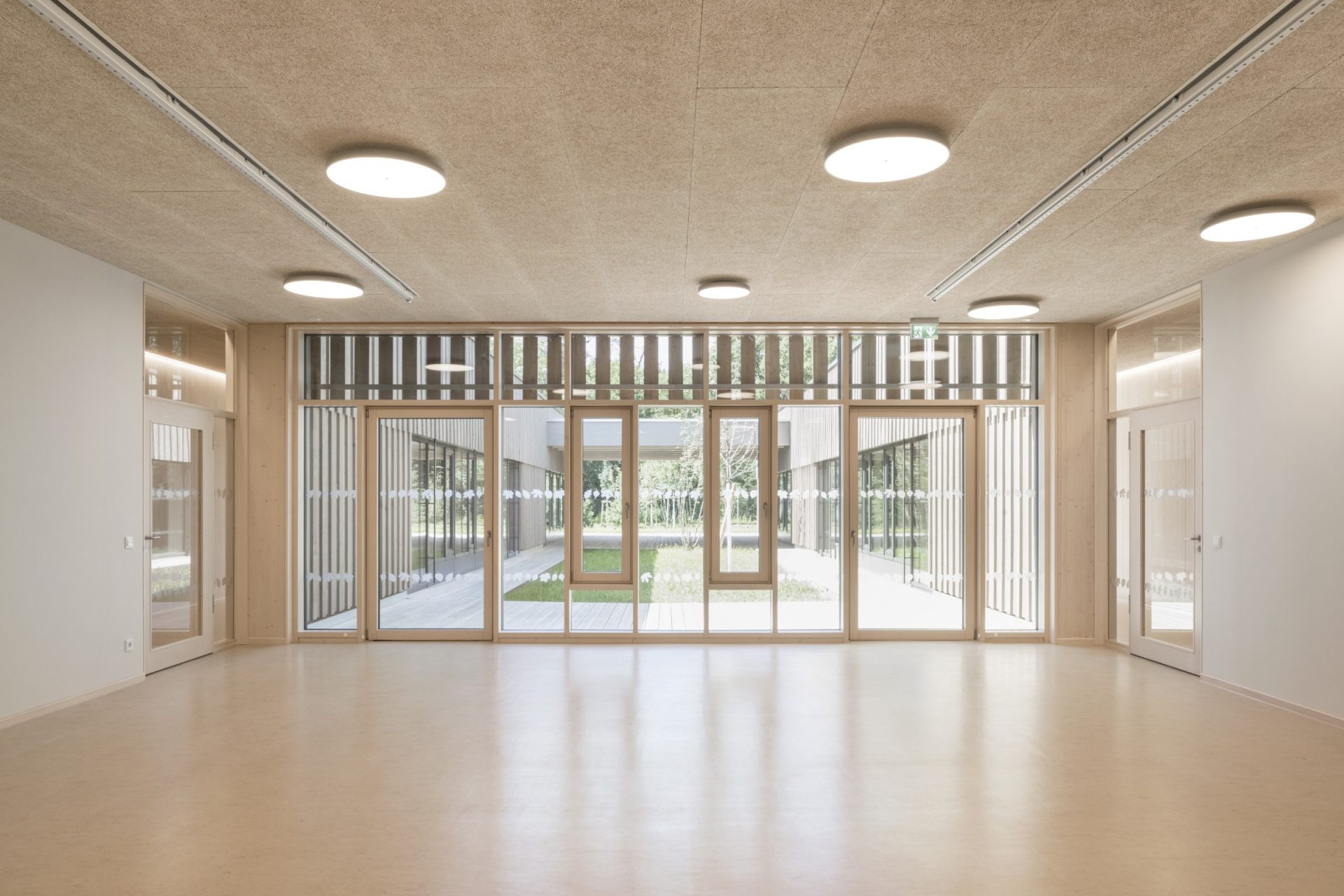 Alle sechs Gruppen sind baugleich auf einer Ebene um den Gartenhof angeordnet. Dadurch sind sie flexibel nutzbar. Im Bedarfsfall kann eine Gruppe für Unterdreijährige jederzeit in eine Gruppe für Überdreijährige umgewandelt werden. Dienende Räume wie die Küche, Vorbereitung und Verwaltung, aber auch die Gemeinschaftsräume (Speiseraum, Multifunktionsraum) sind auf kurzem Wege erreichbar. Kosten für einen Lift sind nicht vorhanden. Statik-, Brandschutz- und Fluchtwegekonzept sind durch die eingeschossige Lösung einfacher und wirtschaftlicher darstellbar. Die Barrierefreiheit ist garantiert und dadurch der Inklusionsansatz im Konzept integriert.