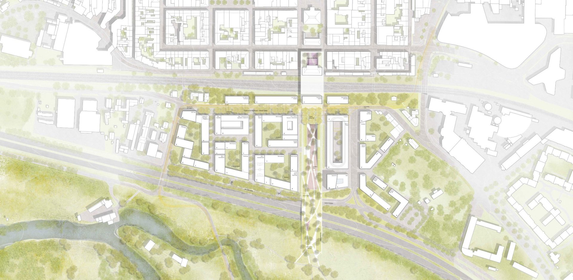 Dazu wird die vorhandene barocke Stadtgründung mit ihrem Orthogonalsystem weiter geschrieben und mit dem Naturraum der Regnitz vernetzt. Eine zentrale Grünachse mit Landschaftsbrücke verbindet den Wiesengrund direkt mit dem Bahnhofsareal und der dahinterliegenden Altstadt.