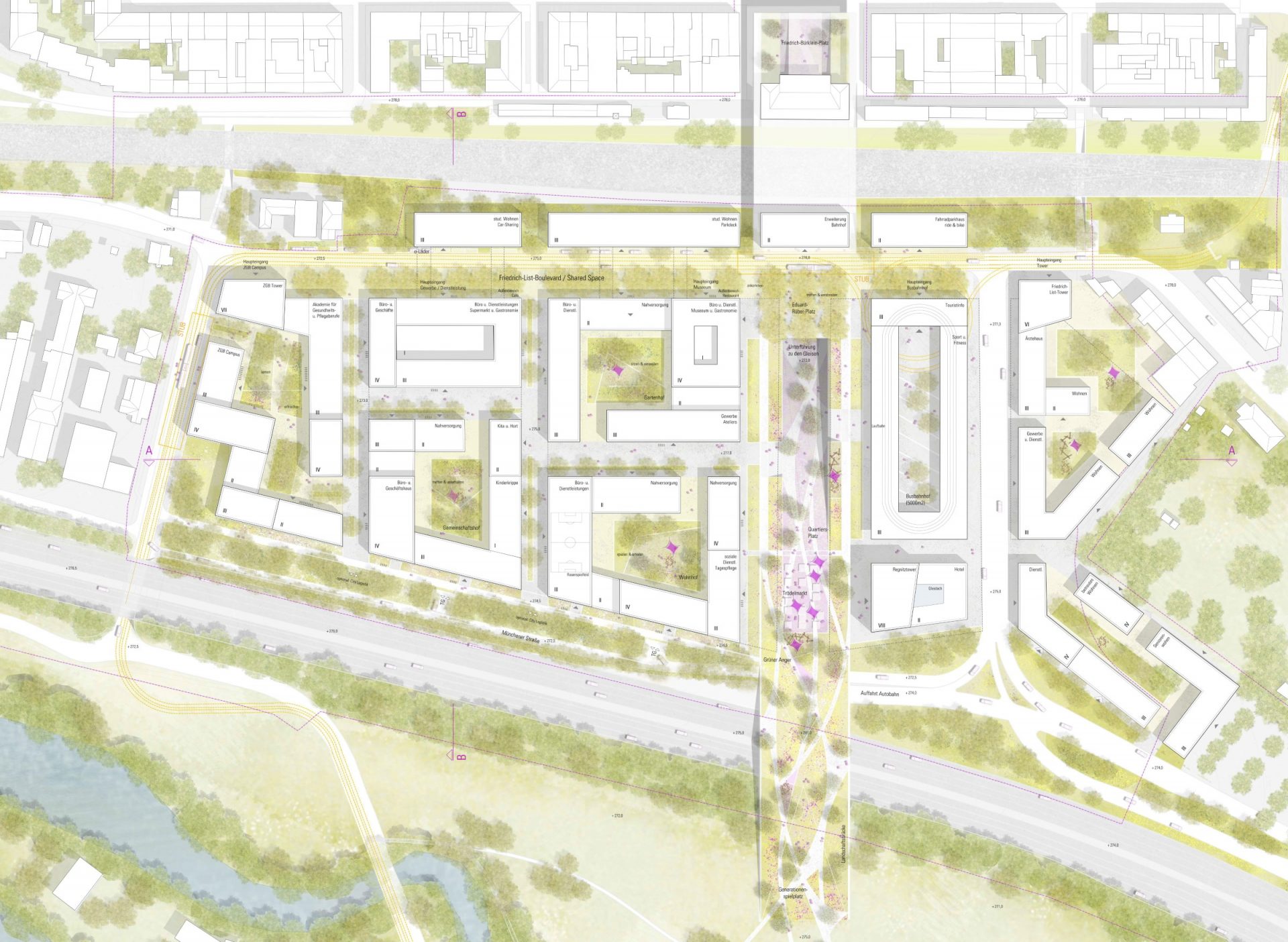Die Barrierewirkung der beiden Verkehrsadern wird dabei reduziert bzw. Überwunden. Der Stadtgrundriss erfährt eine neue historische Ausrichtung, wird durch die RegnitzStadt fortan von Ost nach West gelesen. Die Münchener Straße wird zum Friedrich-List-Boulevard, verkehrsberuhigte Promenade und Shared Space mit Verteilerfunktionen.