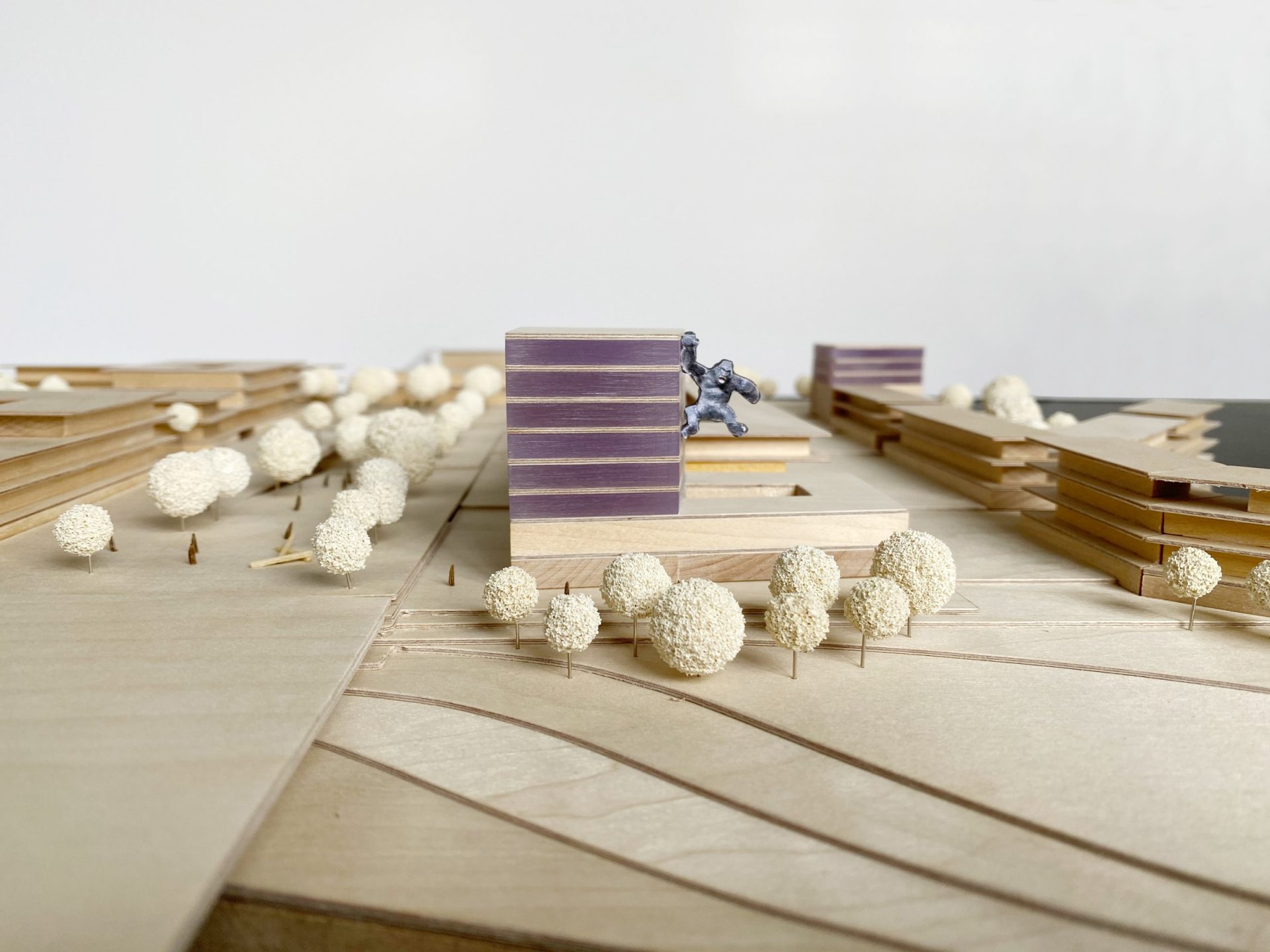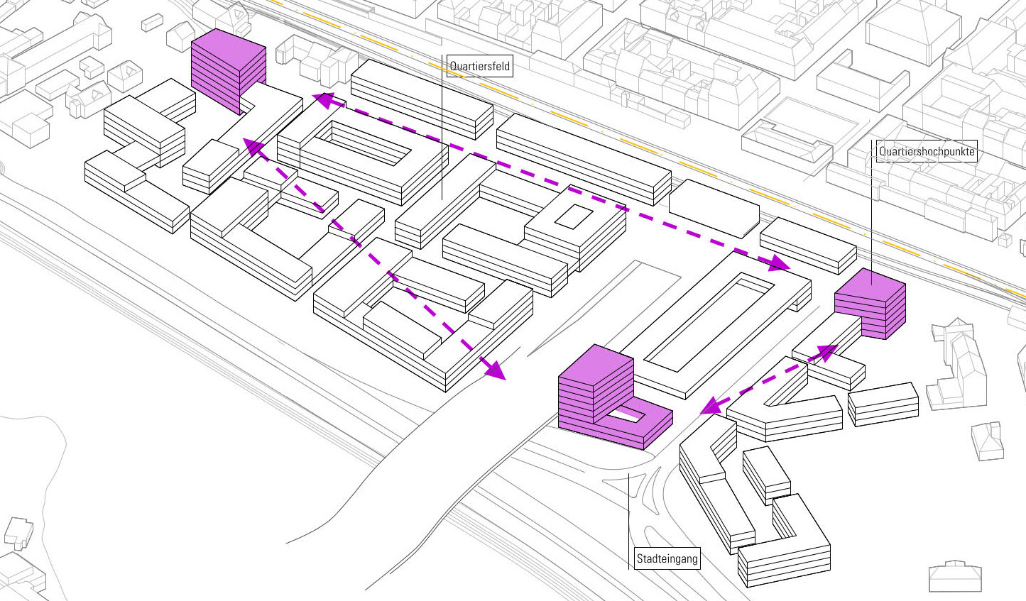 Drei Hochpunkte spannen das Quartier auf und stärken seine stadträumliche Identität ohne mit den historischen Bausteinen zu konkurrieren. Im Südwesten wird ein Stadteingang im “Erlanger Maßstab” ausgebildet.