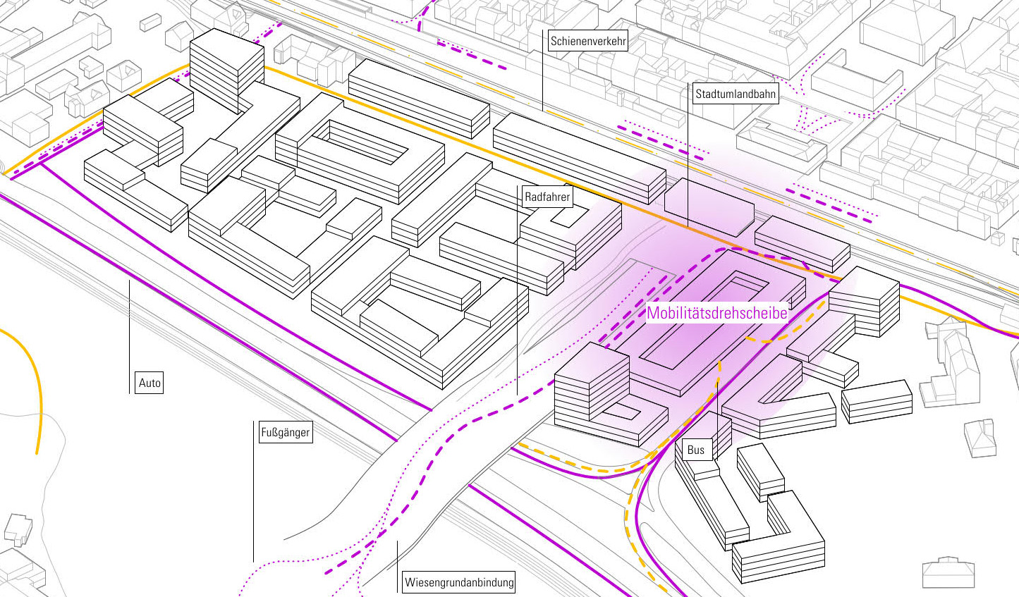 Der Verkehrslärm wird durch entsprechende städtebauliche Anordnungen und der richtigen Wahl der Grundrisstypologie minimiert. Die Blockrandstrukturen sind in dieser Hinsicht eine funktionale Ausgangsbasis. Auch die beiden vorhandenen Verkehrsadern Autobahn und Eisenbahnstrecke können dadurch lärmtechnisch kompensiert werden.