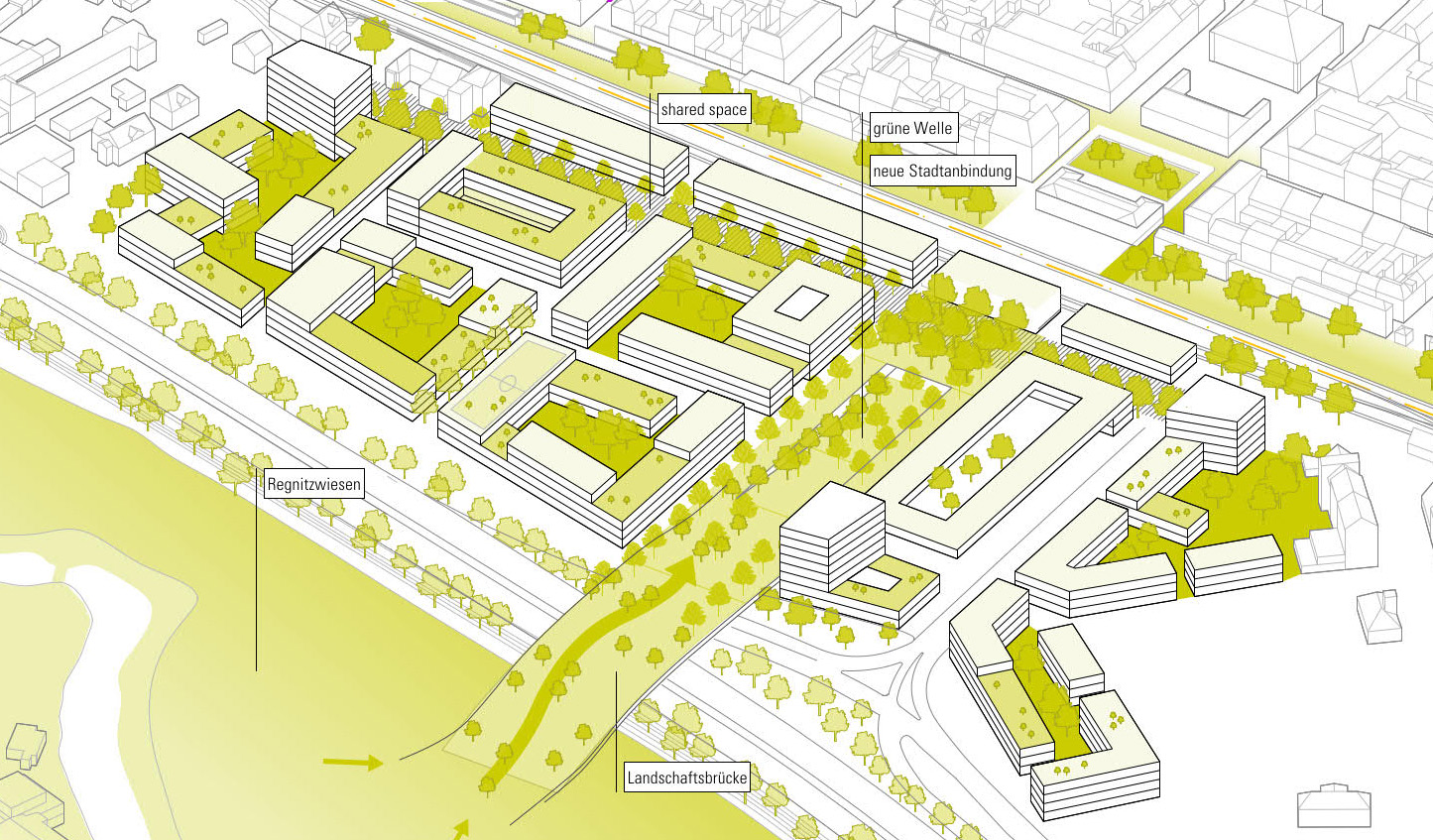 Die Gesamtstruktur wird in die natürliche Topographie eingebettet, die benachbarten Quartiere werden mit der RegnitzStadt verwoben. Das neue Stadtquartier soll in Zukunft eine Gelenkfunktion übernehmen.