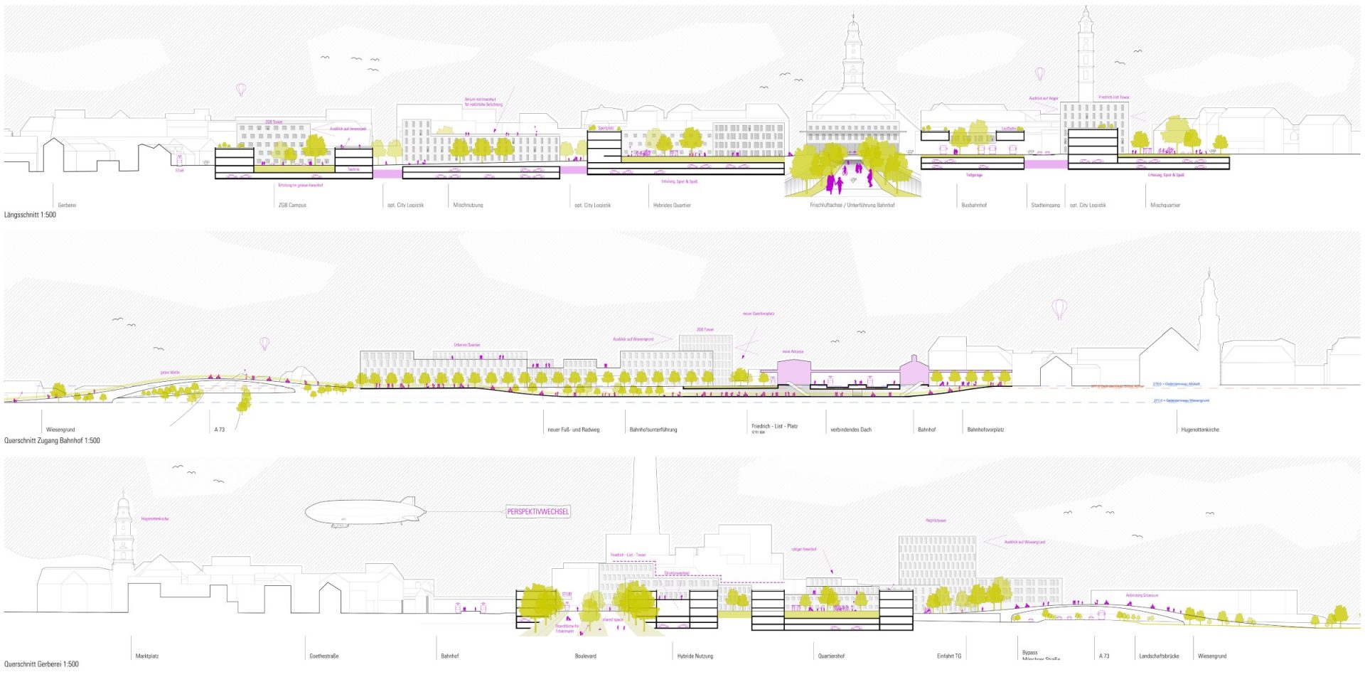 Als zentraler Knotenpunkt fungiert der Hauptbahnhof mit seinem neuen Vorplatz auf der westlichen Gleisseite. Das Bahnhofsgebäude selbst wird baulich ergänzt mit einer Adresse im RegnitzQuartier und einem großen gemeinsamen Dach als verbindendes Element. Auch der Vorplatz in der östlichen barocken Stadt wird neu gestaltet, der Zugang zur Unterführung großzügig geöffnet. Fußgänger- und Fahrradverkehr wird mit Rampen und einer Landschaftsbrücke bis direkt in den Wiesengrund vernetzt. Angsträume werden durch die großzügige Geste vermieden.