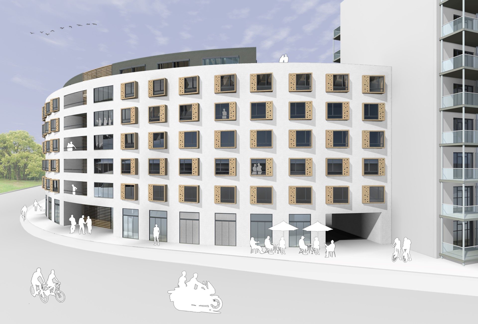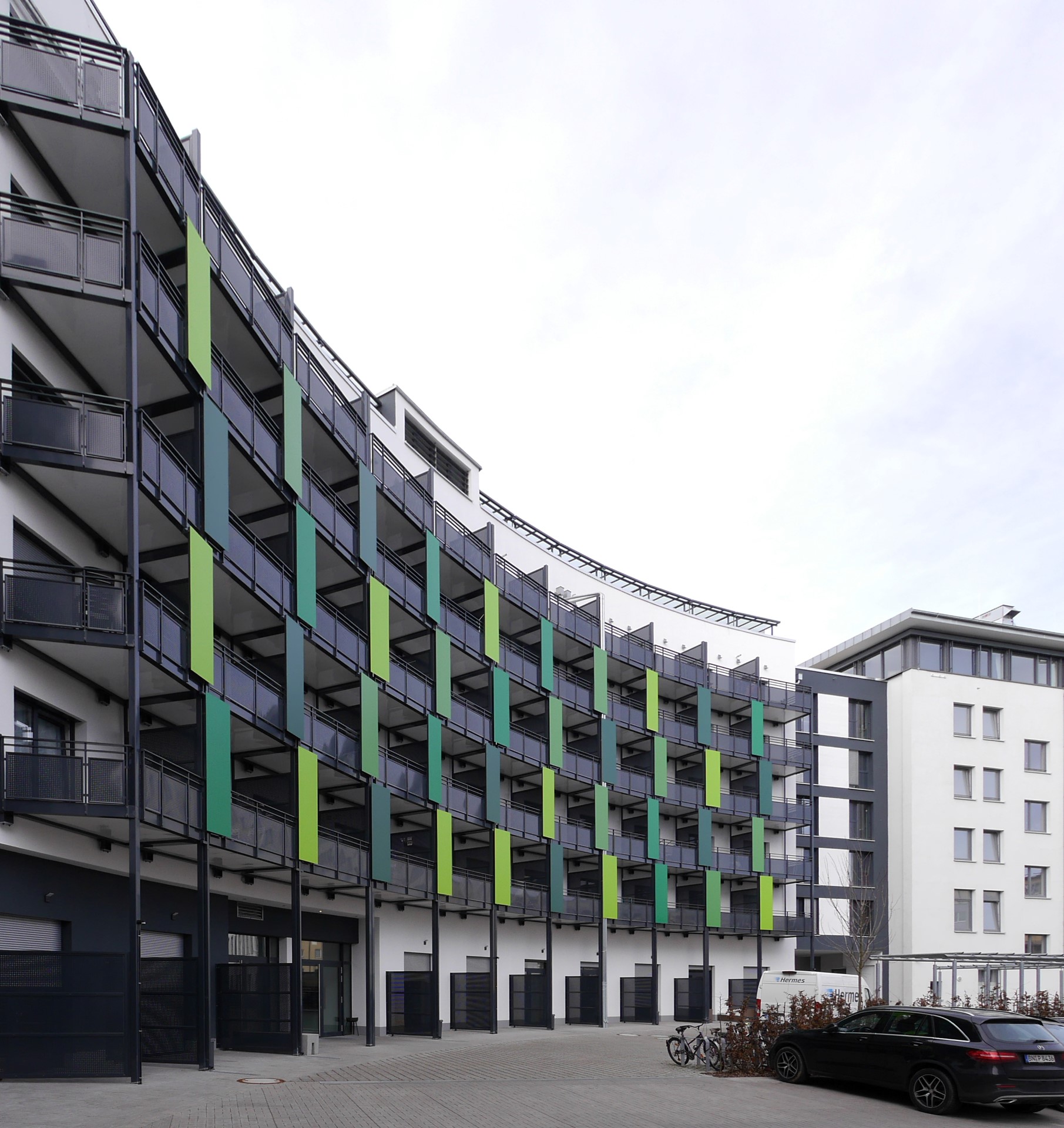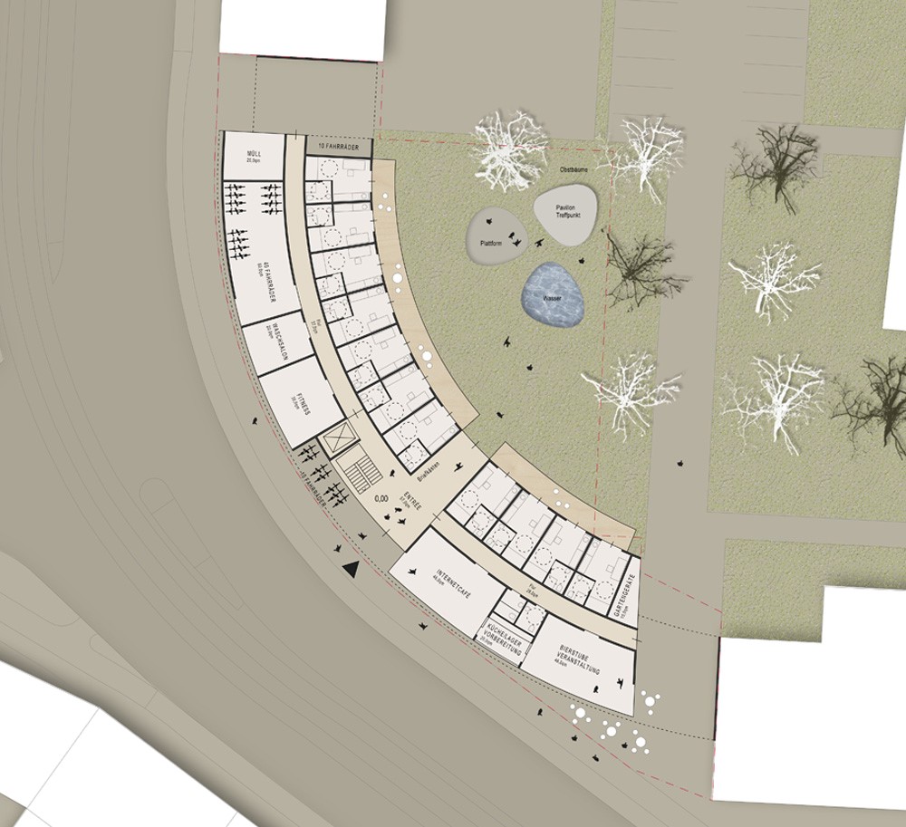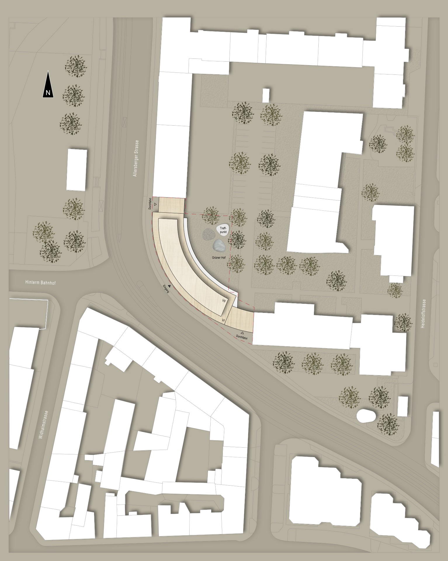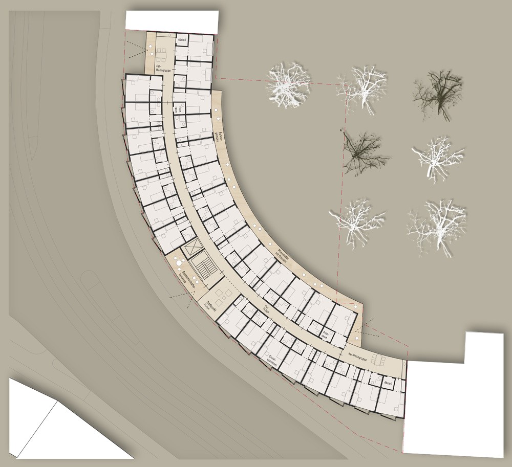 Der Bebauungsvorschlag des Vorbescheides wird aufgegriffen. Das Gebäude wird als zweihüftiger kompakter Baukörper entlang der Allersberger Straße ausformuliert. Die durch das Grundstück vorgegebene Rundung wird aufgenommen. Der Baukörper schließt die bestehende städtebauliche Lücke dadurch mit einer ruhigen Geste ab.Der Haupteingang zum neuen Studentenwohnhaus befindet sich zentral an exponierter Stelle. Zwei Durchfahrten zum Hof ergeben sich in den Anschlussbereichen zu den Bestandsgebäuden.