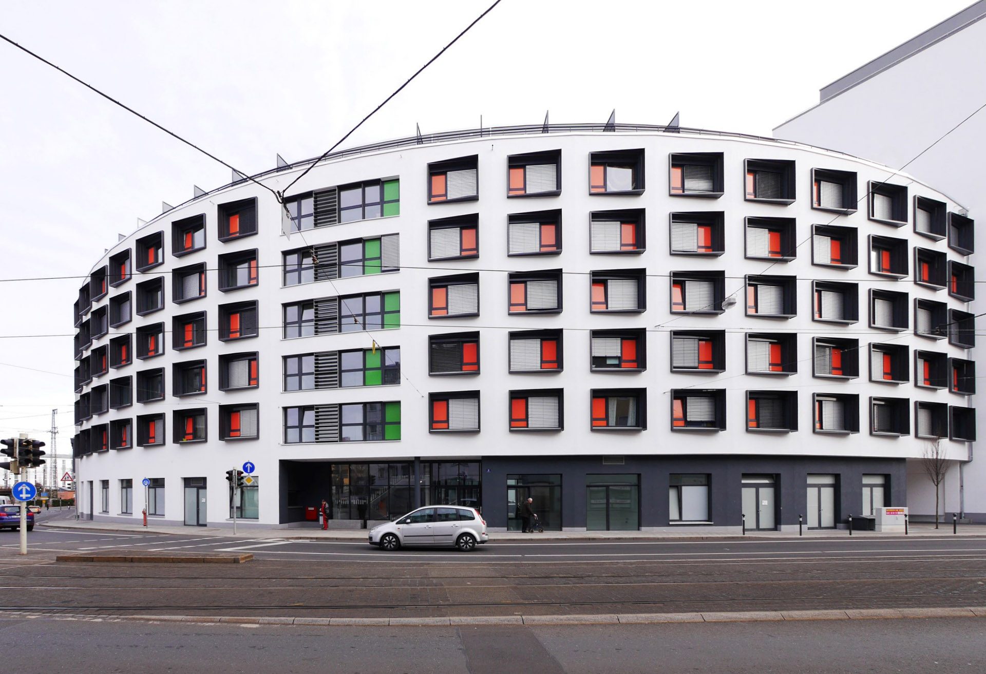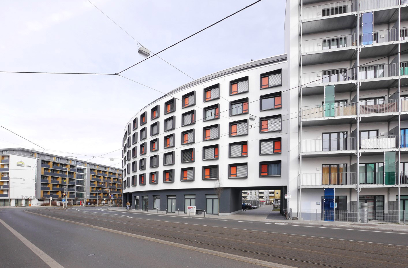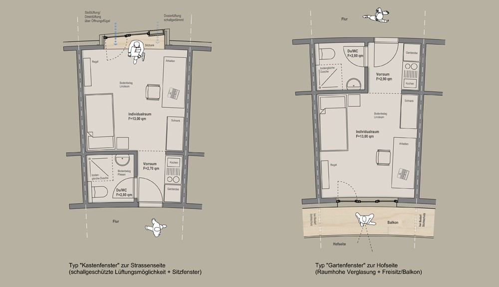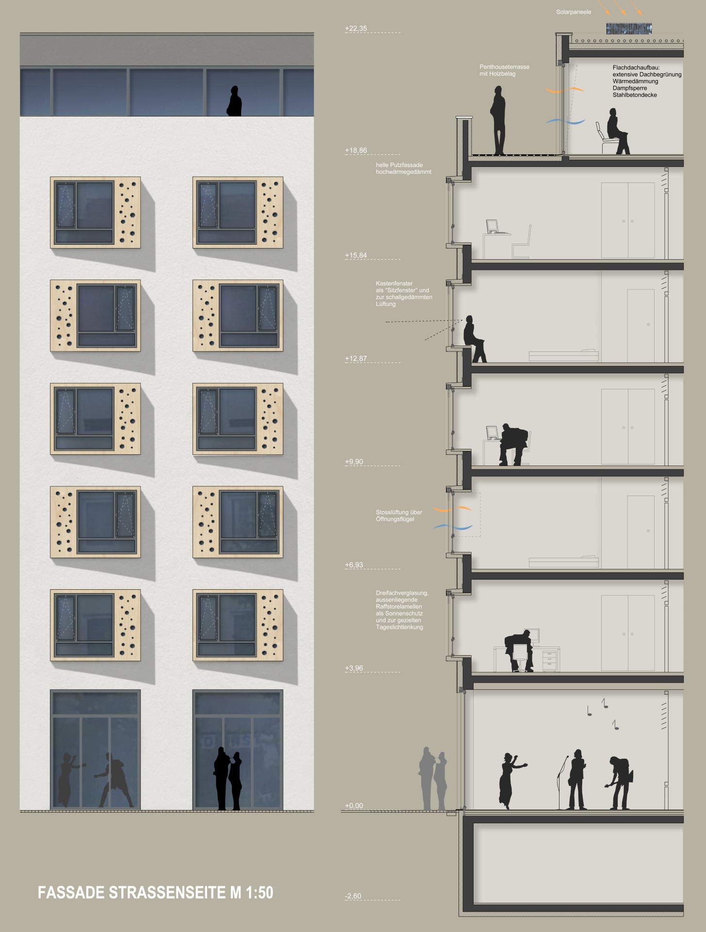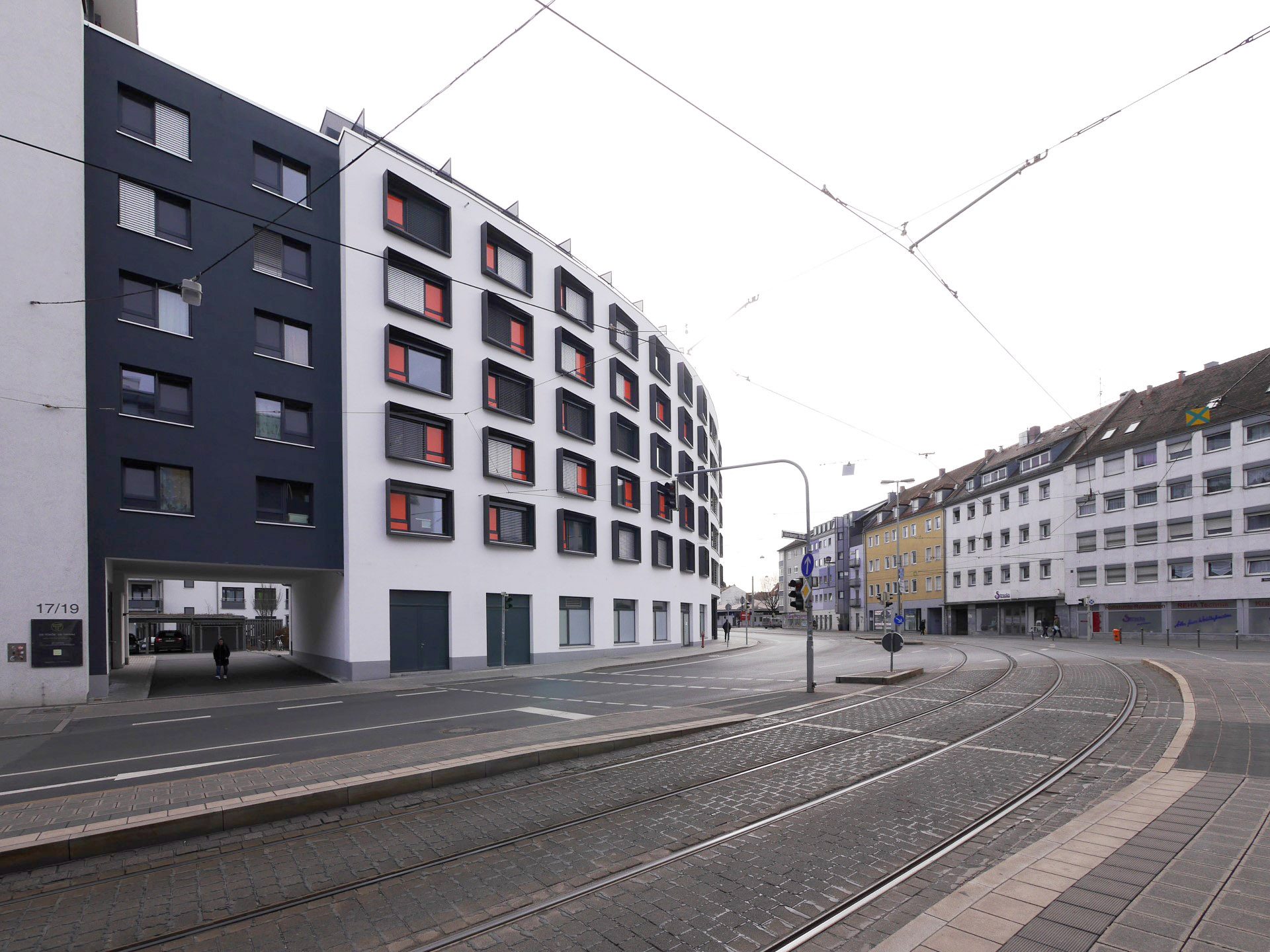 Der Baukörper ist geprägt durch sein einfaches und klares Erscheinungsbild. Die Erdgeschosszone fördert durch ihre einladende Großzügigkeit die Begegnung und Kommunikation zwischen den Bewohnern des Wohnheims und dem restlichen Quartier. Hier werden die Gemeinschaftseinrichtungen wie Internetcafé, Veranstaltungsraum oder der Waschsalon situiert. Die Bierstube erhält eine kleine Vorzone, auf der auch eine Außenbestuhlung möglich ist. Über den zentralen Eingangsbereich mit Treppenhaus und Aufzug wird auch der rückwärtige Gartenhof erschlossen. Hier gibt es einen kleinen Pavillon als Treffpunkt, eine Plattform für Hausfeste und Grillmöglichkeiten, optional ein kleines “Biotop”/Schwimmteich für heiße Sommertage. Der kompakte Grundriss der Wohngeschosse ermöglicht kürzeste Wege für die Bewohner. Die Apartments gliedern sich auf das rückwärtige Erdgeschoss und fünf Obergeschosse auf. Pro Geschoss gibt es 2 Wohngemeinschaften, die im Bedarfsfall aber auch als Einzelapartments genutzt werden können (Flexibilität der Grundrisstruktur). Im Erdgeschoss gibt es 11 rollstuhlgerechte Apartments, welche über die Hofseite erschlossen werden. Auch die restlichen Wohneinheiten sind komplett barrierefrei erschlossen. Die Grundrisstypologie bietet zahlreiche Kommunikationsmöglichkeiten. In jedem Geschoss gibt es, angelagert an das Treppenhaus, einen Gemeinschaftsraum/Lernraum als Flurerweiterung. Die Gemeinschaftsbereiche erhalten vorgelagerte Loggien. Ziel ist es, eine kommunikative Lebenswelt mit Rückzugsmöglichkeiten und in angenehm entspannter Atmosphäre zu schaffen. Integration, Gemeinschaft und individuelle Lebensgestaltung müssen sich gegenseitig nicht ausschließen.Im Penthouse sind zwei große Wohneinheiten vorgesehen. Sie erhalten großzügige vorgelagerte Terrassen mit Panoramablick über die Nürnberger Stadt-Kulisse. Die Einheiten funktionieren unabhängig vom Studentenwohnen und sind über das zentrale Treppenhaus mit Aufzug erschlossen. Kellerersatzräume werden auf dem Geschoss angeboten. Die Rundung der Straßenfassade wird durch schräg gesetzte Kastenfenster akzentuiert. Sie sind Schallschutzelement und “Sitzfenster”. Ein Öffnungsflügel ermöglicht kurzes Stoßlüften, ein Dosierlüfter wird zum funktionalen Ornament und erlaubt eine schallgedämmte Lüftung während der Ruhe- oder Lernzeiten. Die Gartenseite ist geprägt durch vorgelagerte Balkone. Sie dienen als zusätzliche Aufenthaltsbereiche und bieten Möglichkeiten, Gartenkräuter oder Balkongemüse zu pflanzen. Semitransparente farbige Paneele als zweite Haut akzentuieren die Gartenseite und schützen vor neugierigen Einblicken. Müllräume und Abstellräume für Gartengeräte werden in den Durchfahrten angeordnet, wo sie das Gesamtbild des Gebäudes nicht stören und dennoch auf kurzem Wege für alle erreichbar sind.
