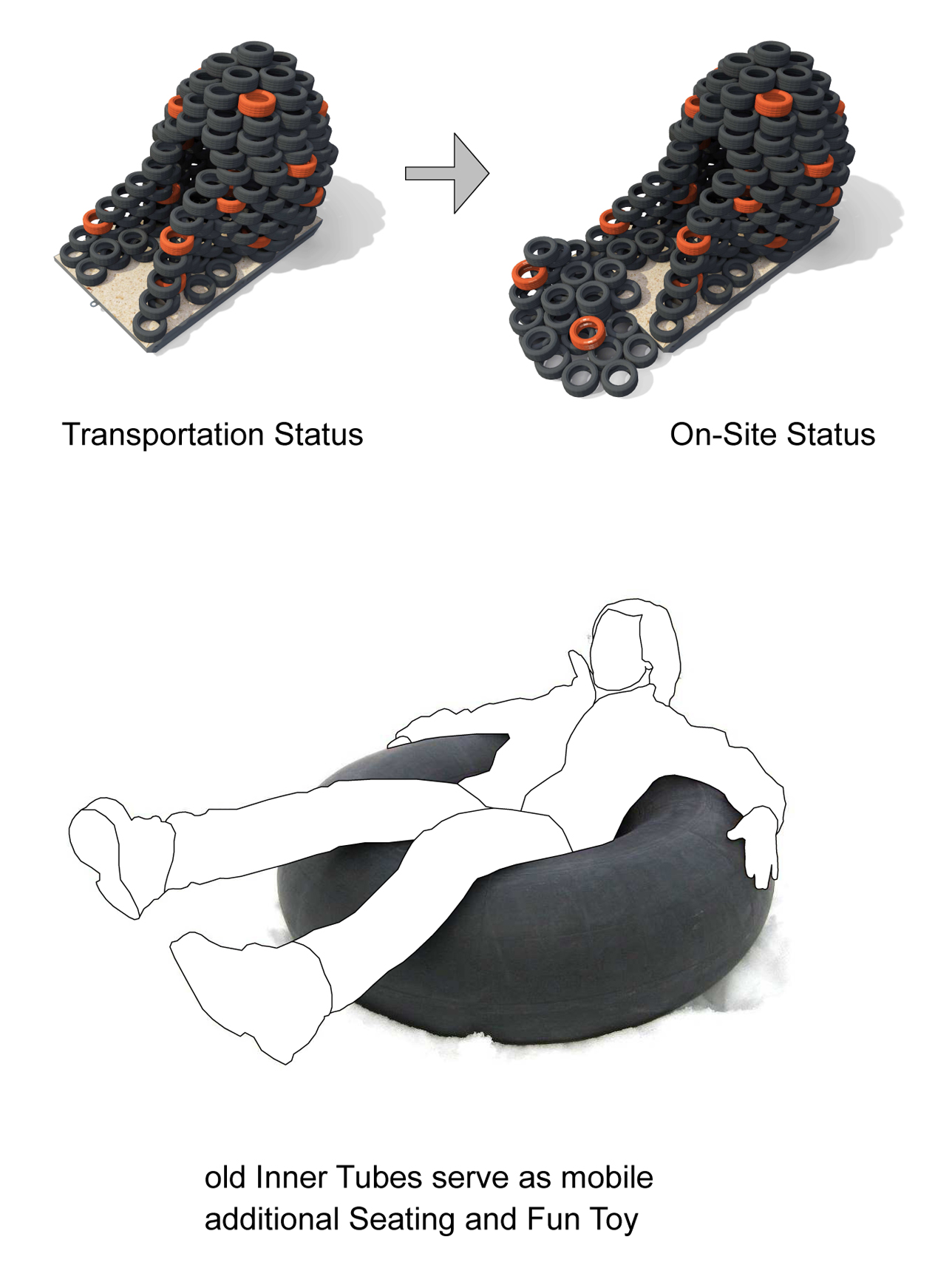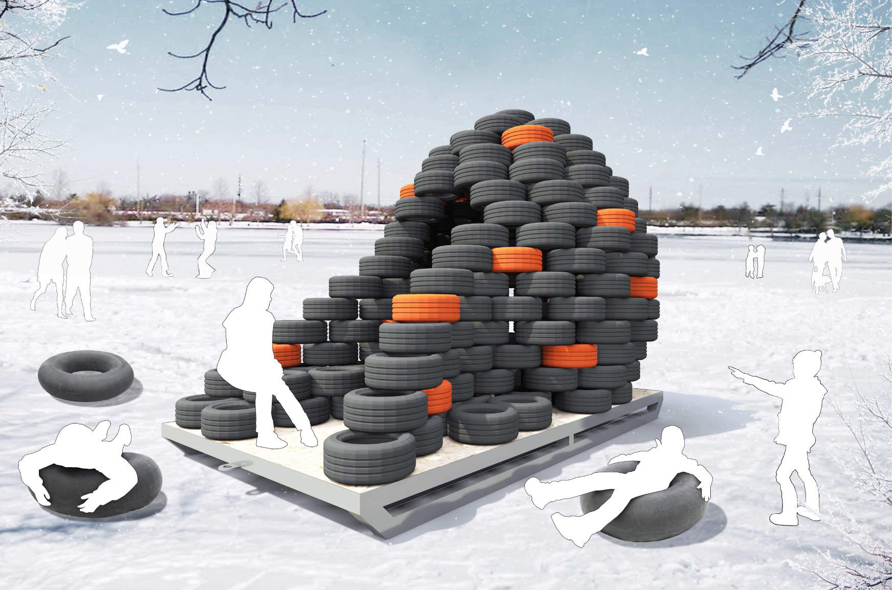 during the day. Some of the tires are painted in orange to accentuate the structure. The tires can also be used as seating. Rubber and air have isolating qualities. Additional mobile seating is offered by a couple of inner tubes. They can also be used as snow fun toys.