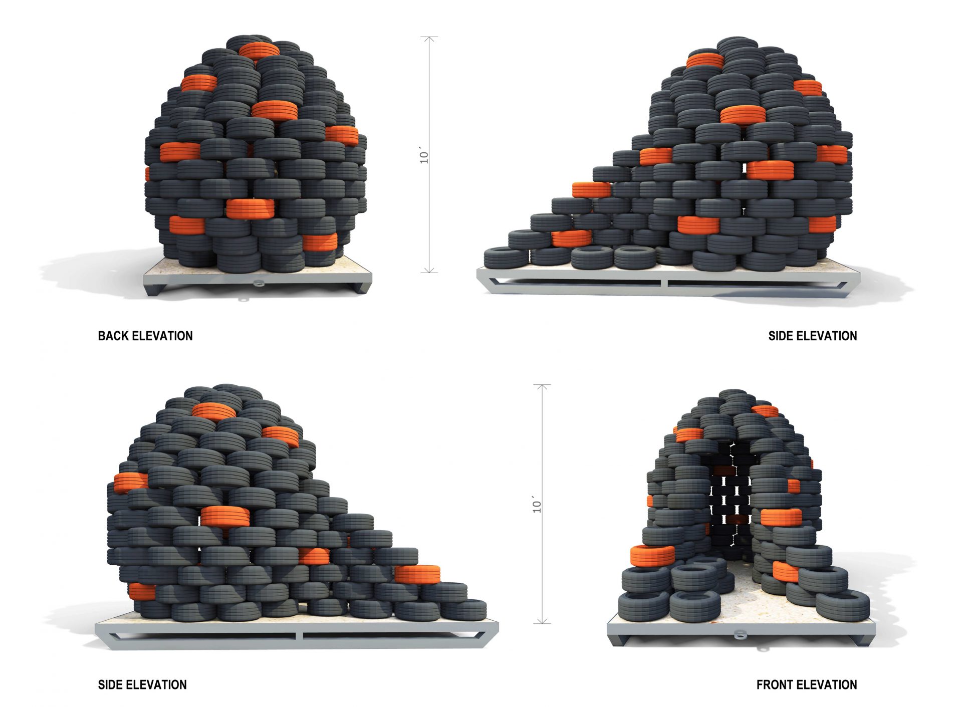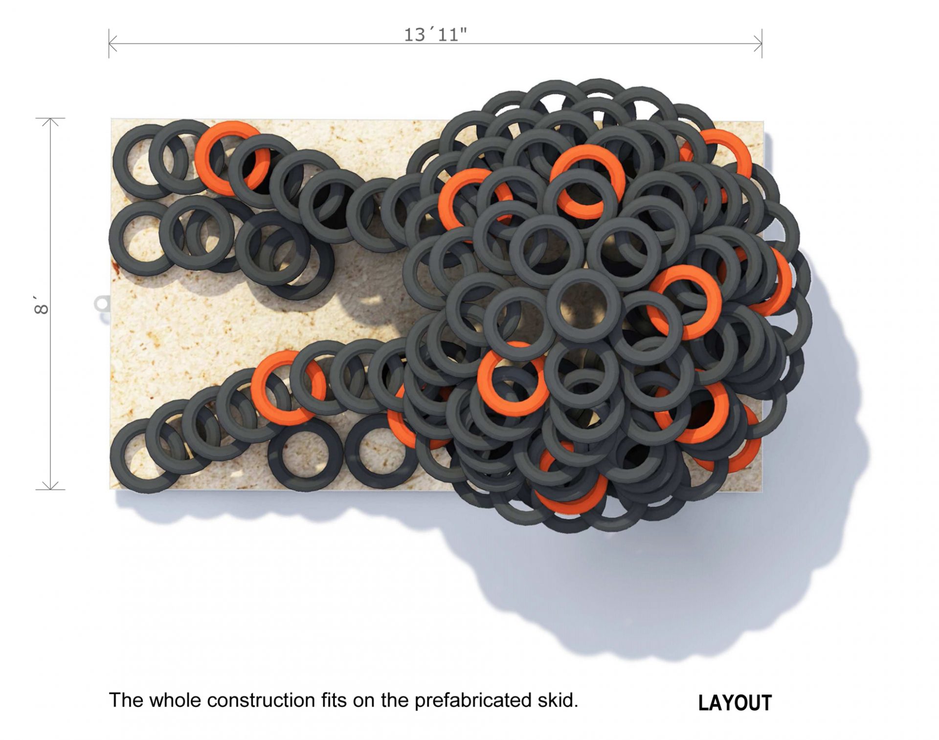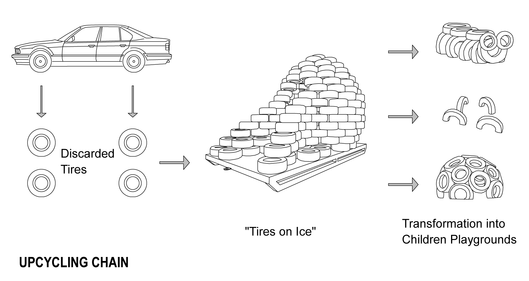 stockpiles grow, seas of tires exist in dumps around the globe. But the same characteristics, which make waste tires such a problem, can also make them one of the most reused waste materials, as the rubber is very resilient and so it can be reused for other products and contexts. To draw more attention to the complex of problems with increasing tire dumps all over the world, we want to set an upcycling example. We use discarded tires as construction material for our warming hut 2014.