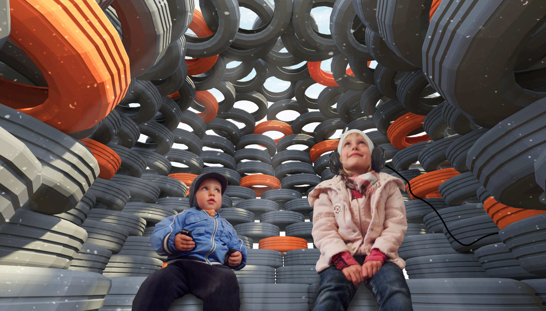 amplifying the ambient sounds. The result is audible via headphones provided inside the tire dome. Passerbys can sit down and relax, listening to an upcycled sound-collage warming their ears.