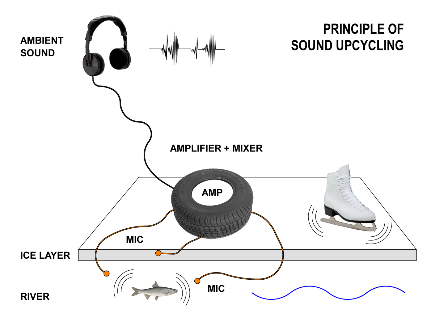Different sounds characterize the soundscape of the skating trail. Some of them are obvious, others are smooth background noises filtered by layers of snow and ice. Several contact microphones are set inside and under the ice layer of the trail. They pick up hidden ambient sounds around the artifact and from Assiniboine River. Sounds of moving water, crushing ice, skaters creaking etc. The microphones are connected to a mixer merging and