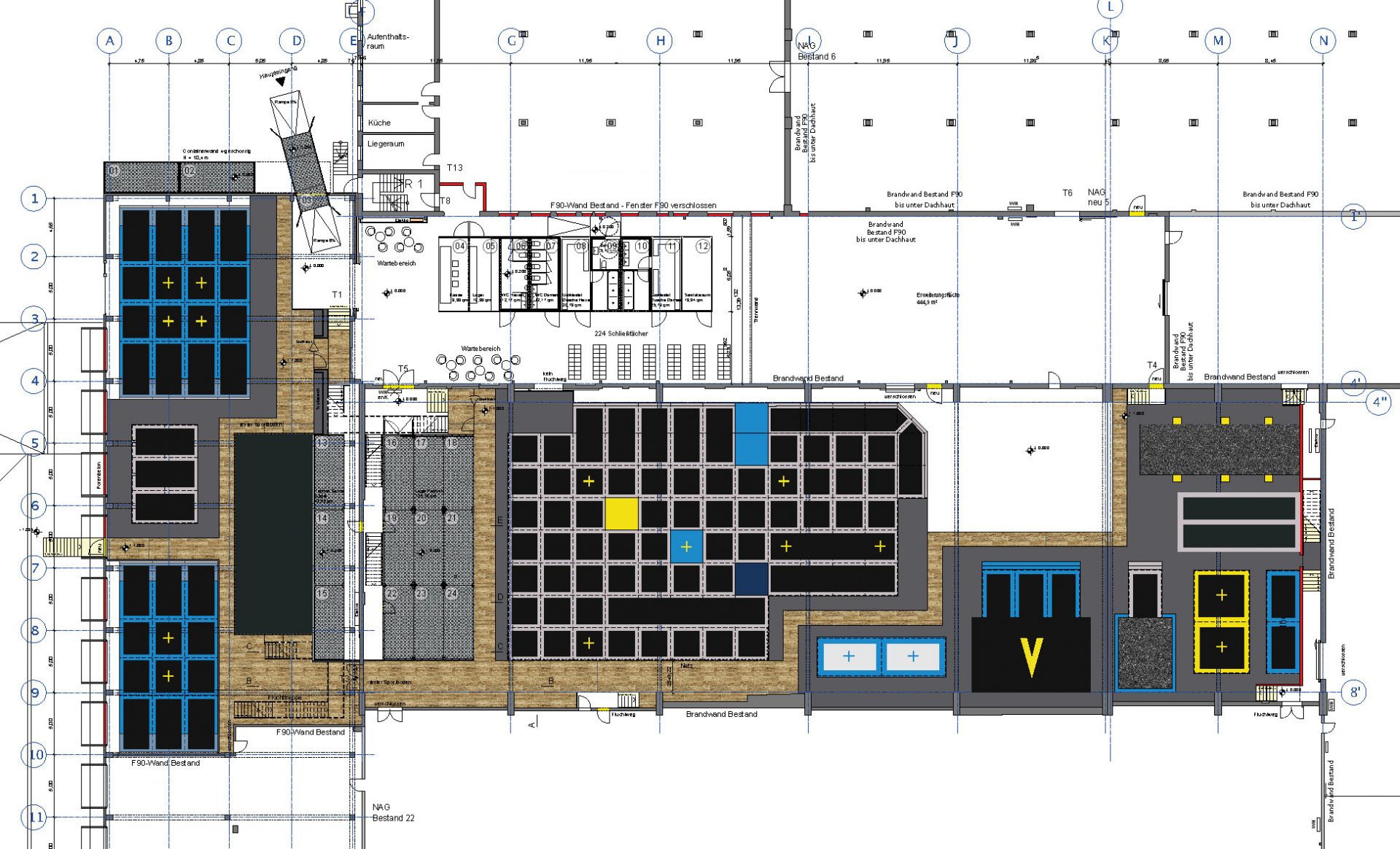 Zusammen mit der Jump Besitz GmbH und Roland Nörpel entwickeln wir das Konzept für die Umnutzung einer 1937 erbauten und denkmalgeschützten Halle in Nürnberg Schafhof. Auf fast 4000 m² entsteht eine performative Trampolinlandschaft mit unterschiedlichen Aktionsfeldern. Recycelte Seecontainer ergänzen das Corporate Design und dienen als funktionale Einbauten für Umkleiden, Bistro und Sanitäreinheiten.